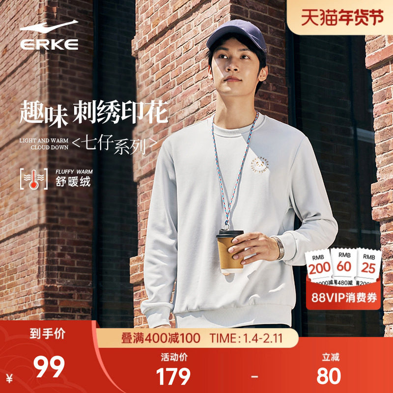 七仔丨鸿星尔克加绒卫衣男2025冬季新款男士圆领运动宽松套头上衣