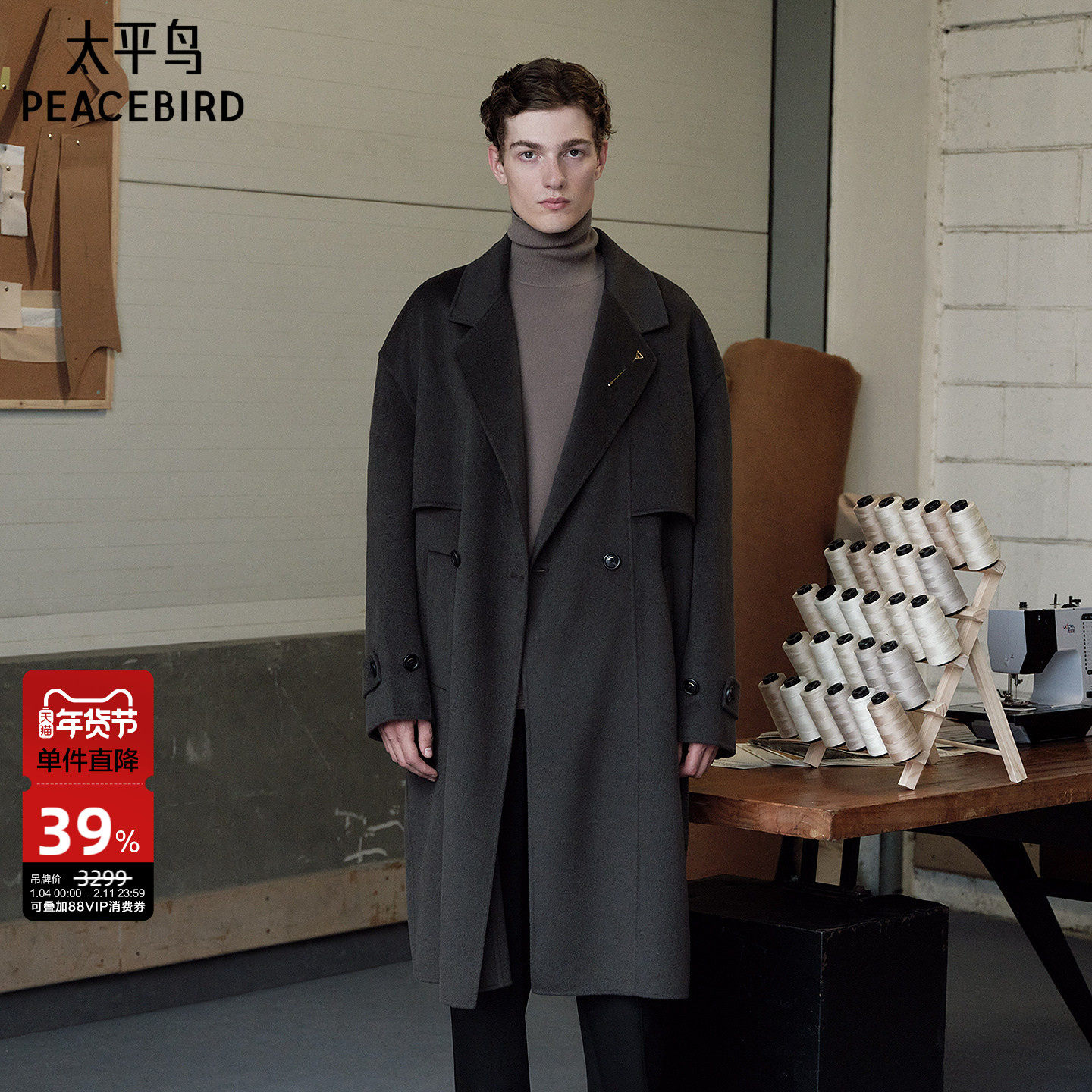 【100%绵羊毛】报喜鸟柴斯特斜纹中长款男大衣堑壕双面呢短款外套