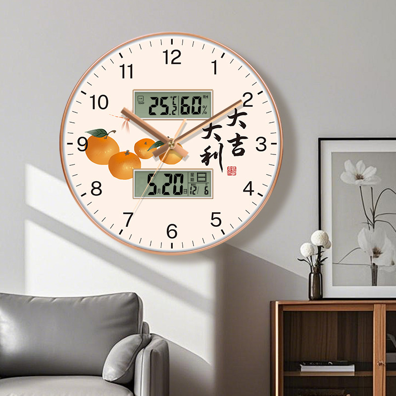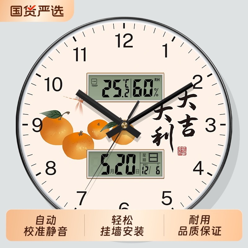 大吉大利家用中国风挂钟客厅家用带温时度日历时钟免打孔电波钟