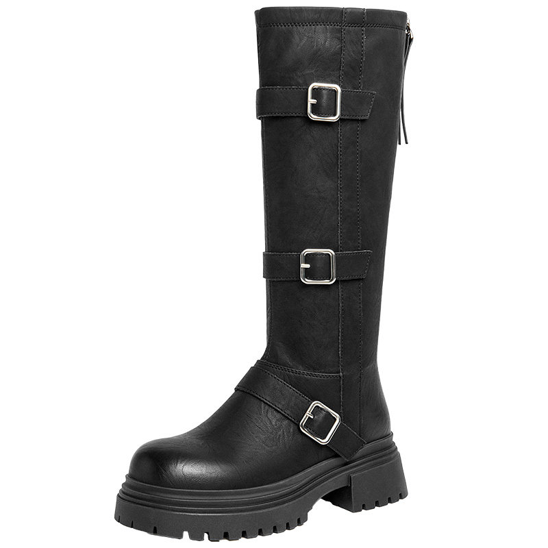 真皮~骄屿皮带扣骑士靴复古英伦风长筒靴棕色显瘦粗跟不过膝长靴