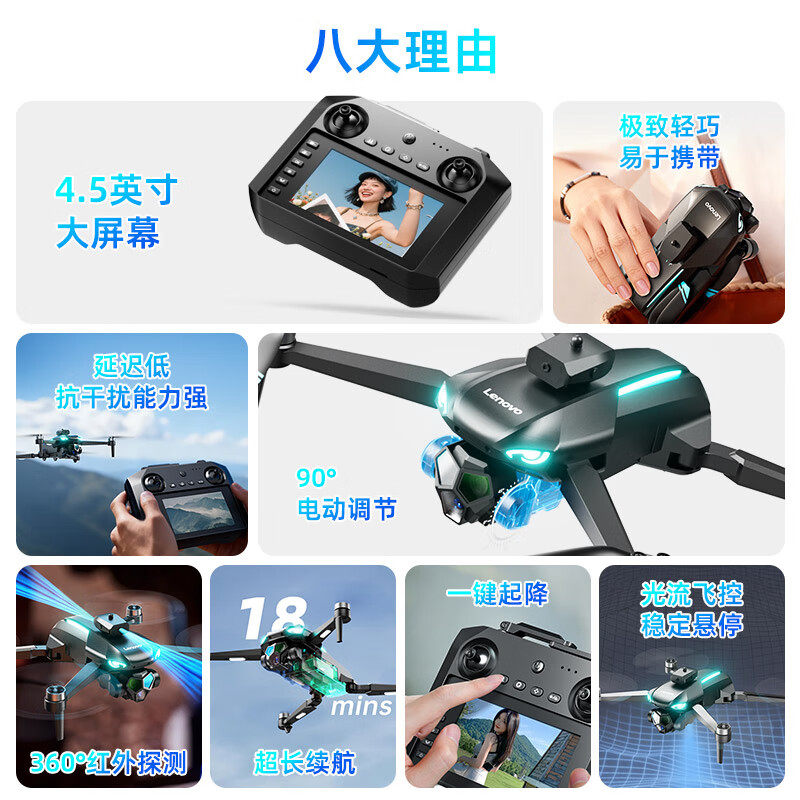 联想(Lenovo)无人机专业航拍高清带屏幕遥控器中学生男孩遥控飞机玩具专业航拍飞行器生日礼物