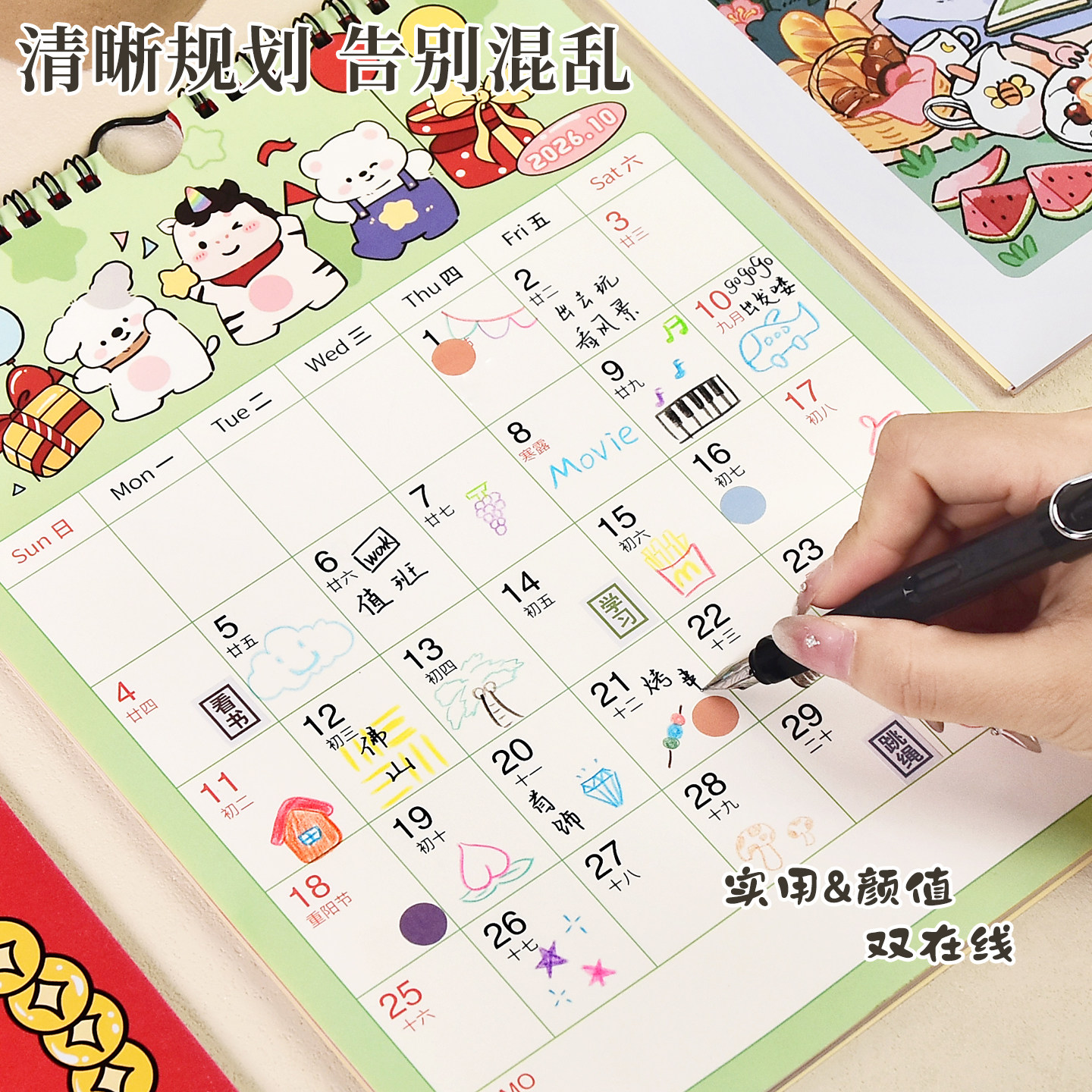 2026年卡通挂历ins风创意手绘大号挂墙挂历a3打卡计划表装饰画家用马年记事日历本365天考试倒计时时间管理表