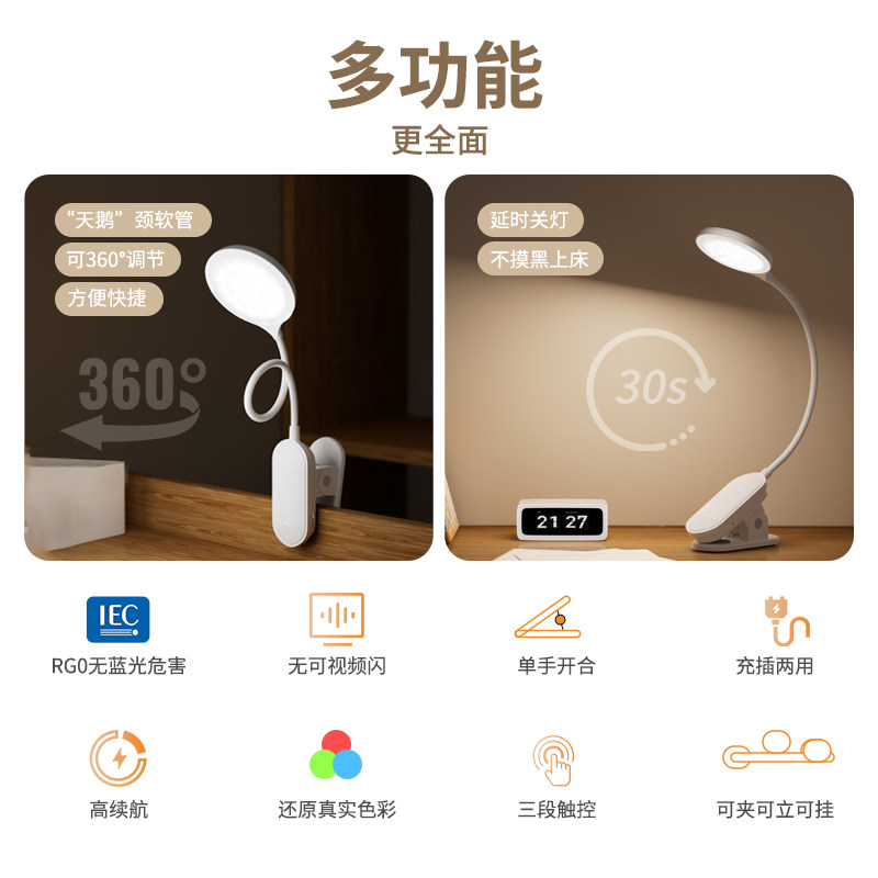 优乐明夹子可夹式充电台灯宿舍大学生阅读床头灯护眼学习专用卧室