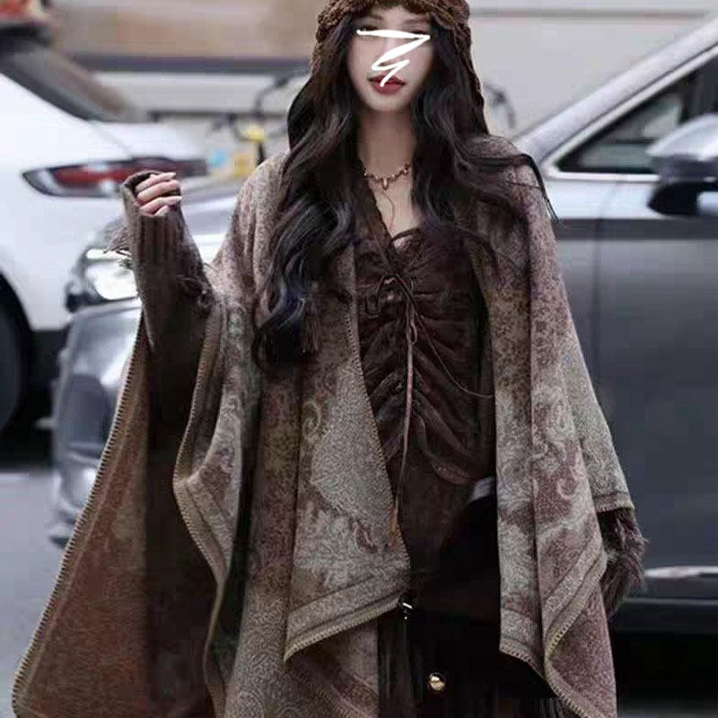 波西米亚民族风复古披肩外搭女川西云南保暖披风斗篷围巾冬季棕色