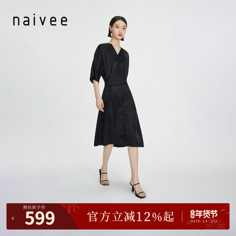 naivee纳薇新中式女装V领宽松真丝连衣裙桑蚕丝提花赴宴轻礼服女