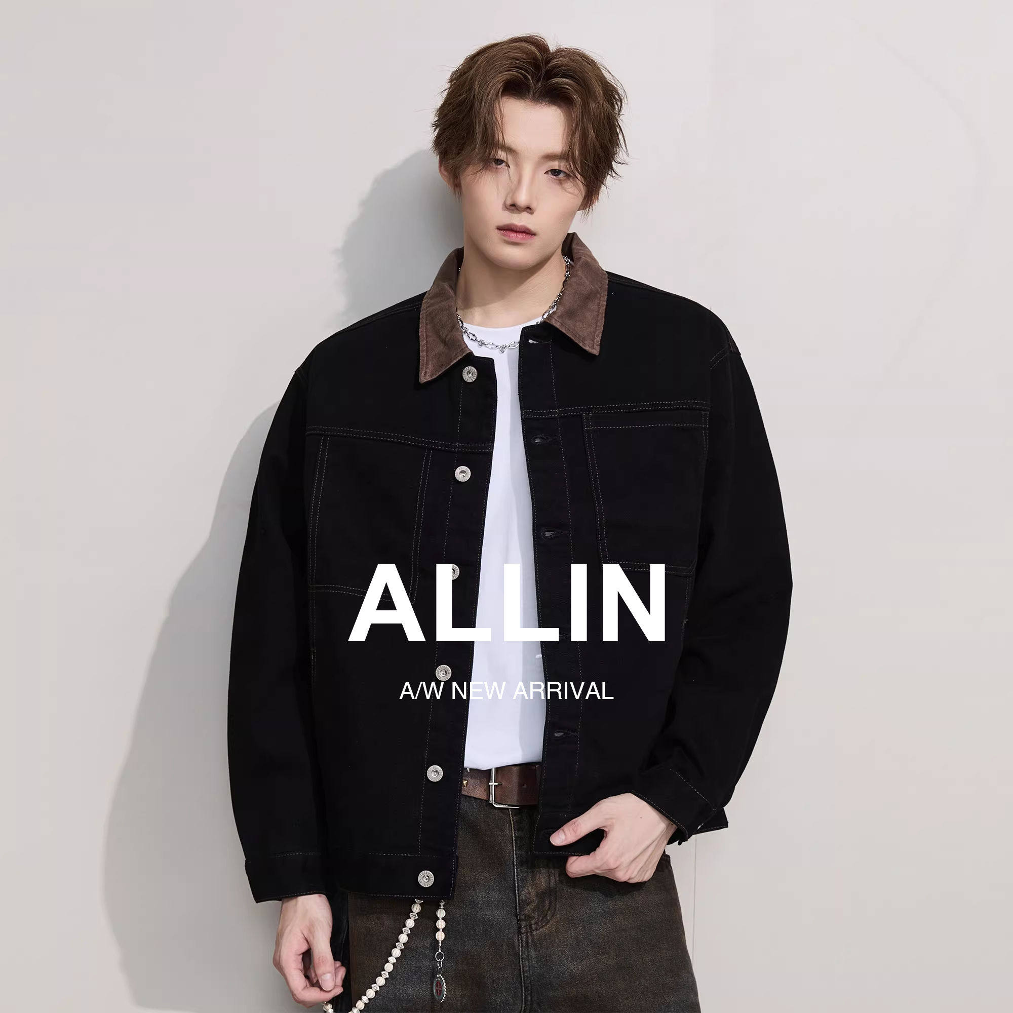 ALLIN 巴恩风底特律水洗牛仔外套男秋冬情侣cleanfit翻领休闲夹克