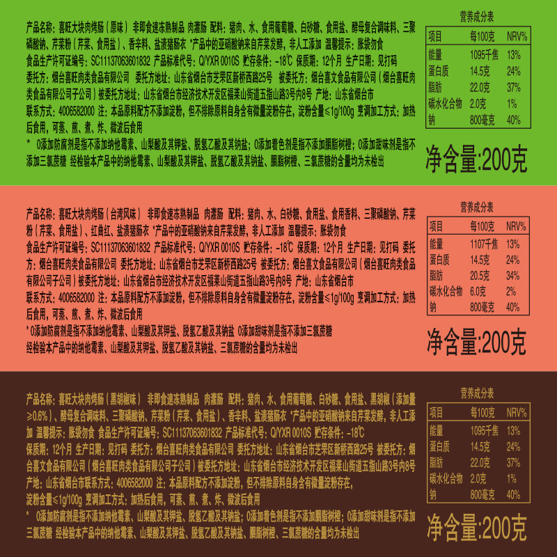 喜旺大块肉烤肠200g*3盒多口味爆汁香肠猪肉肠空气炸锅美食早餐肠
