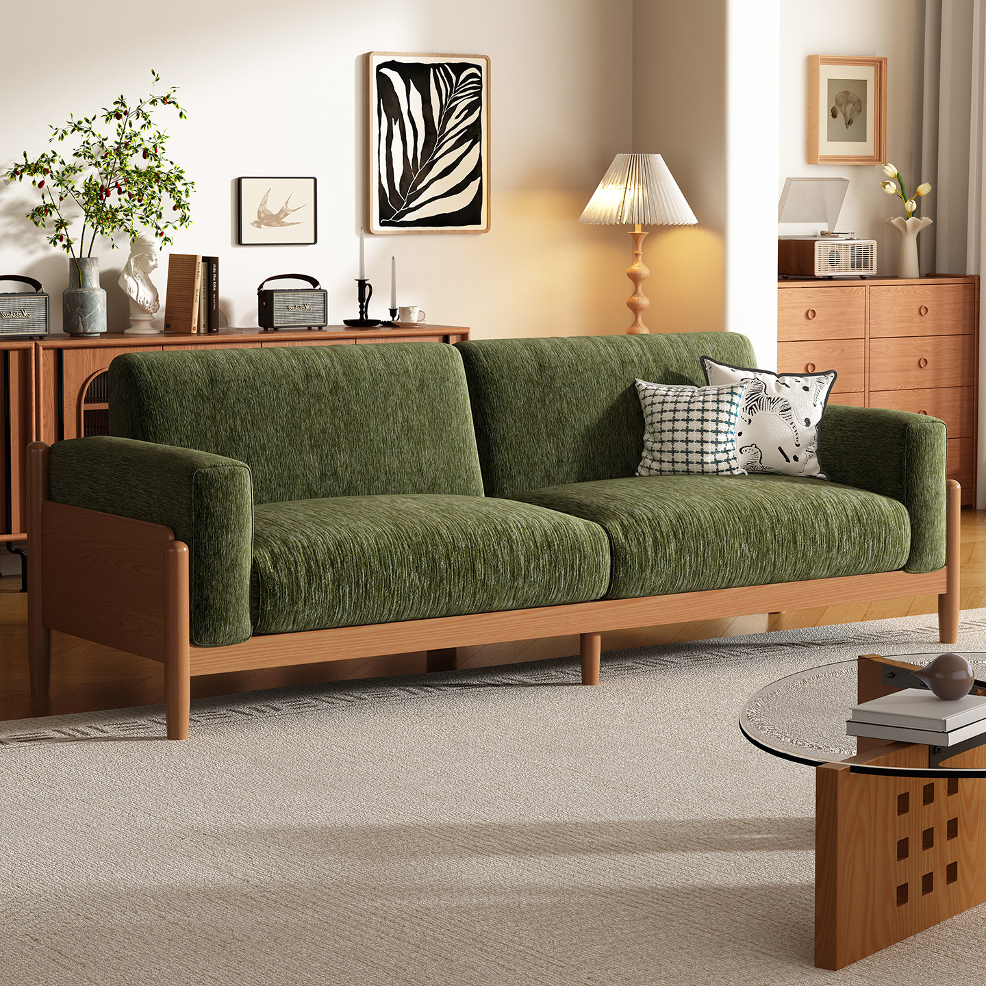 布艺沙发小户型客厅直排三人位实木榉木奶油中古原木风可拆洗沙发