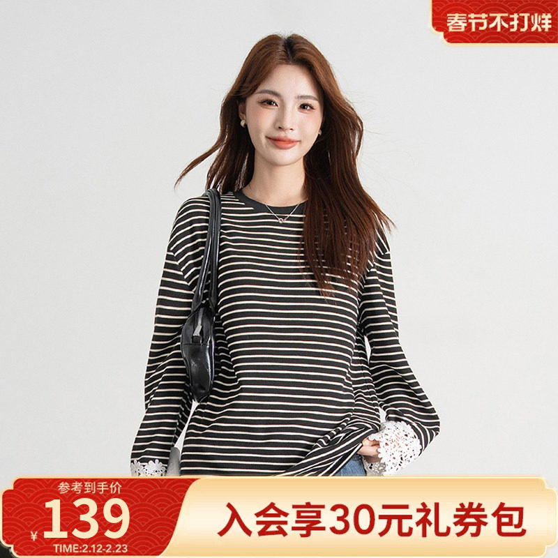 热风女士时尚袖口蕾丝甜美减龄复古条纹衫秋季百搭休闲长袖T恤