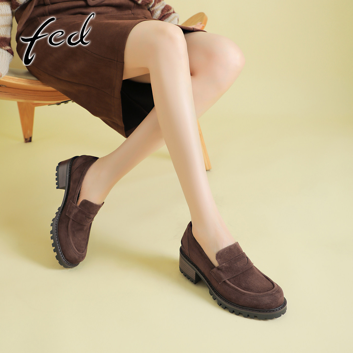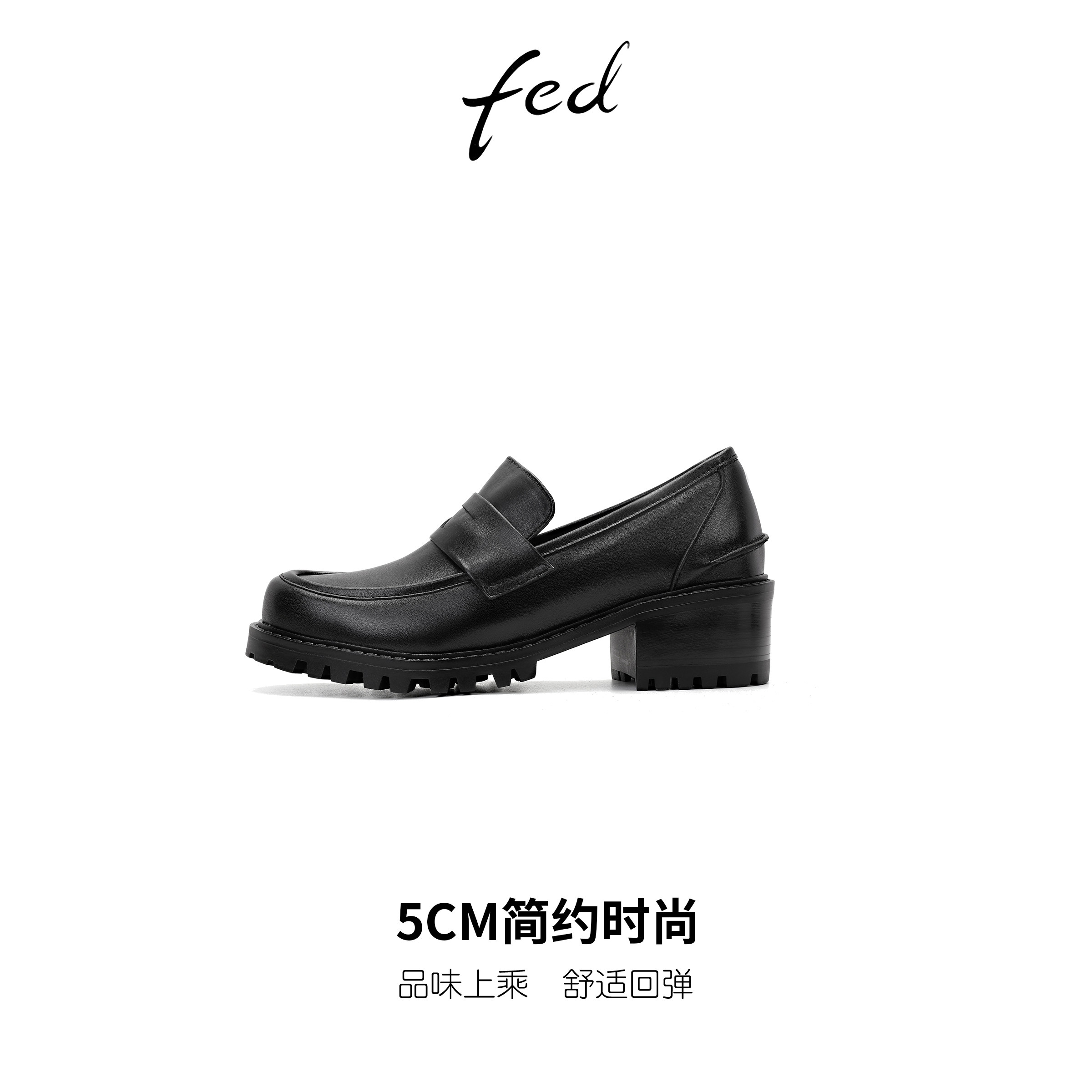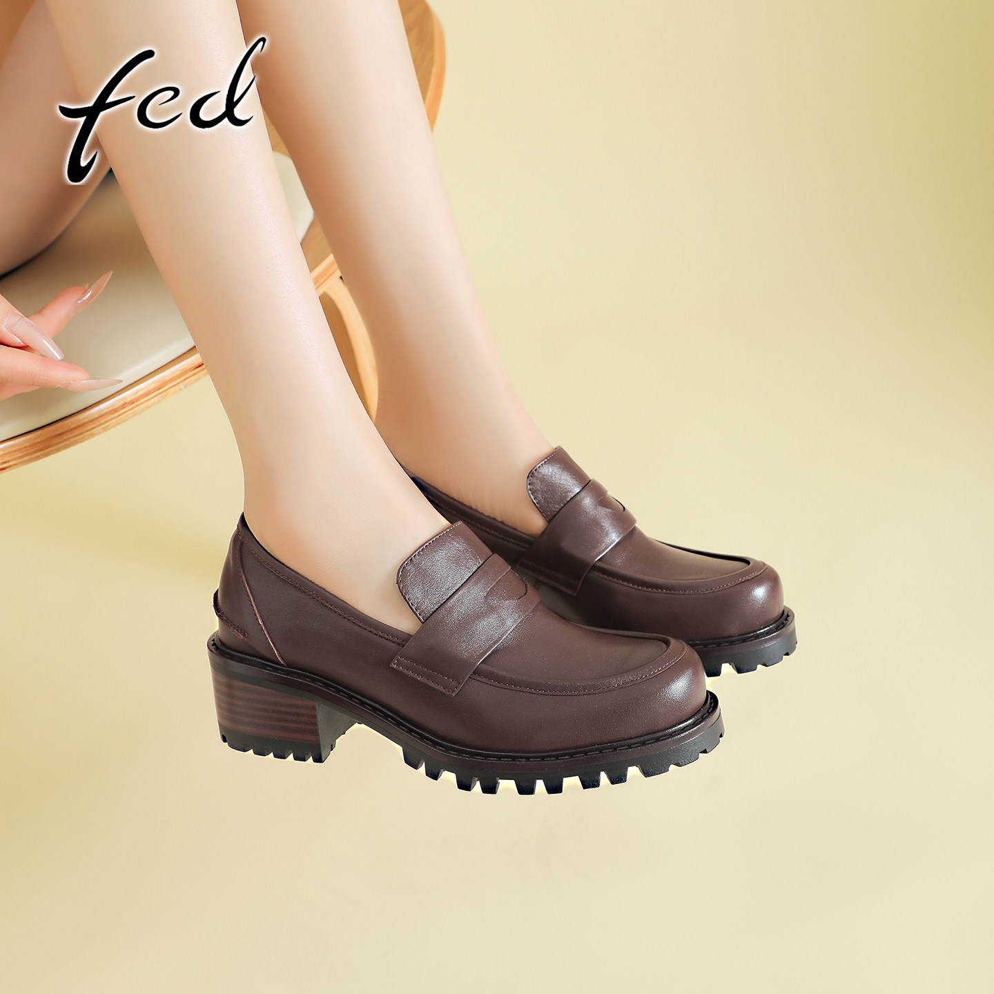 fed真皮粗跟厚底乐福鞋女复古通勤小皮鞋一脚蹬懒人圆头深口单鞋