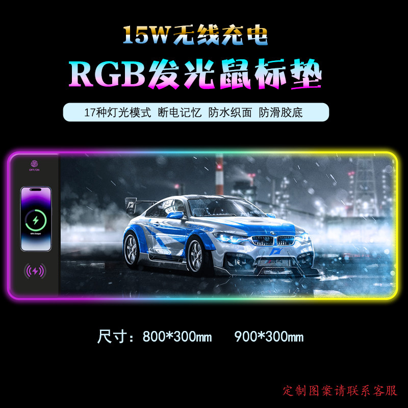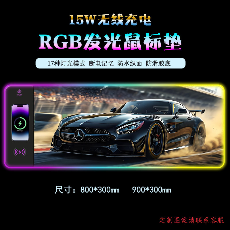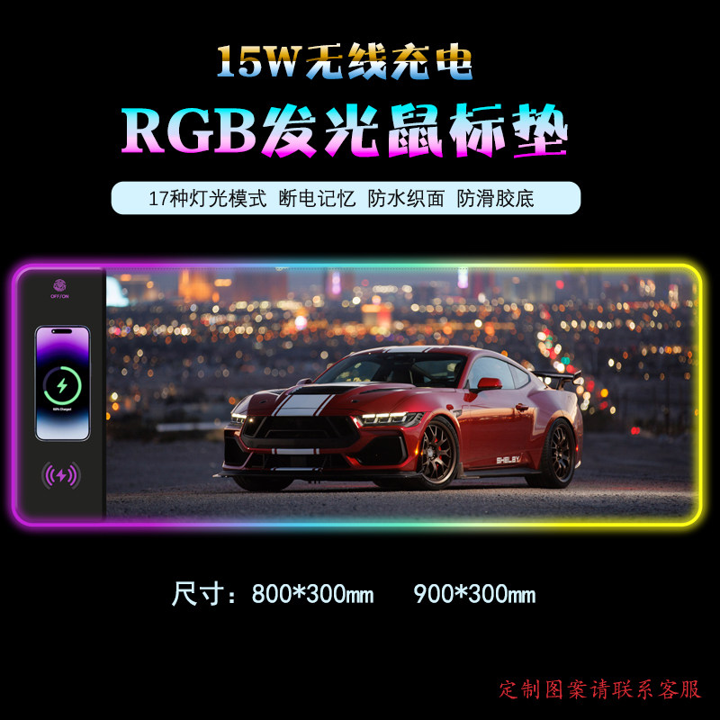 汽车跑车无线充鼠标垫15W快充磁吸RGB发光超大炫光电竞奢华男人垫