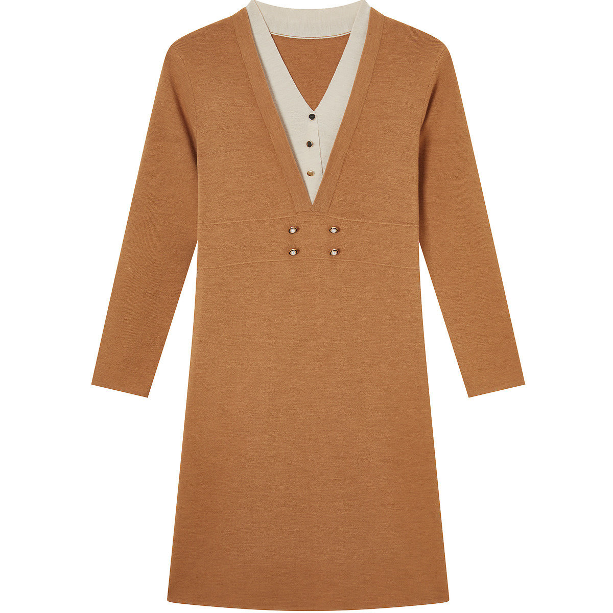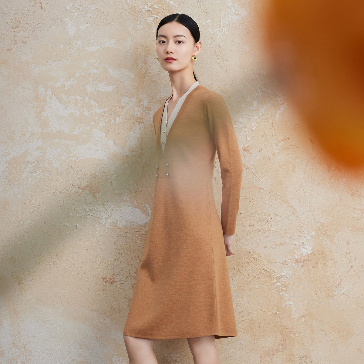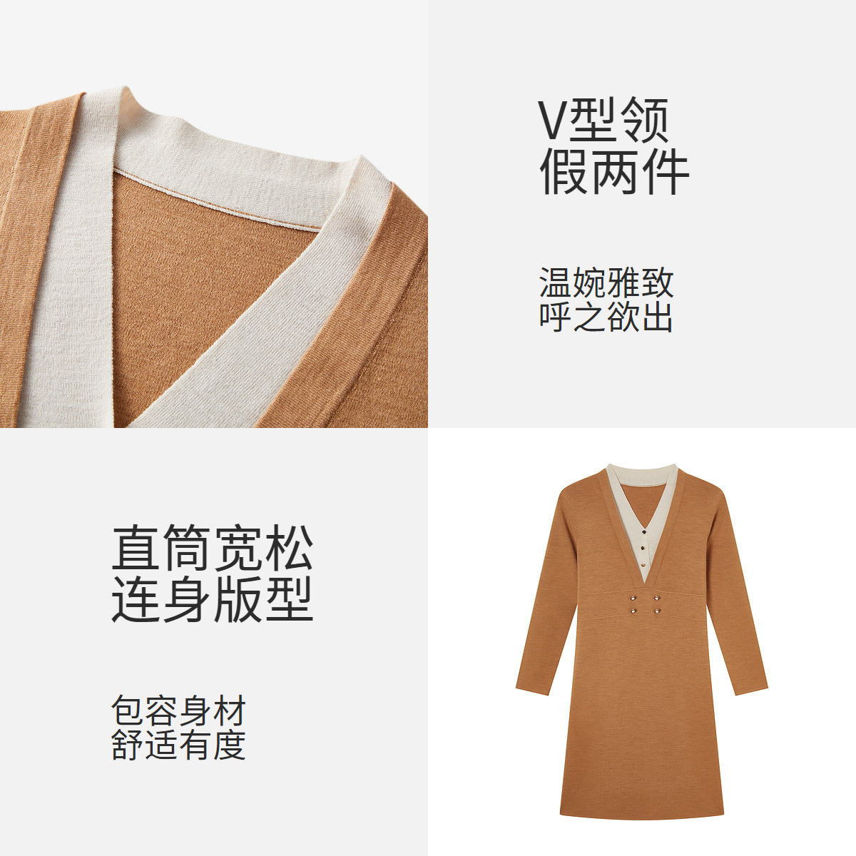 菲妮迪品牌假两件连衣裙2023冬季新款简约风时尚设计感羊毛裙子女
