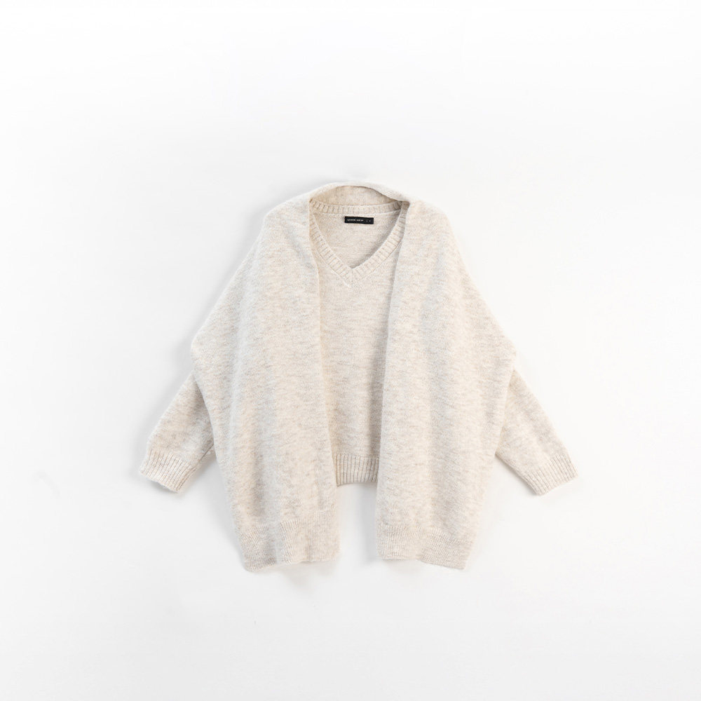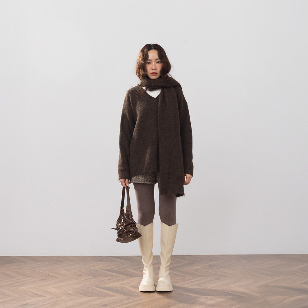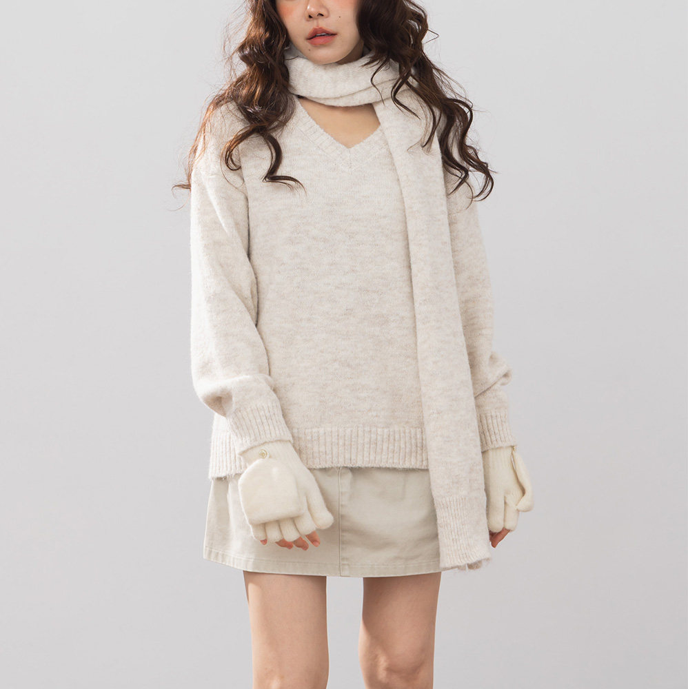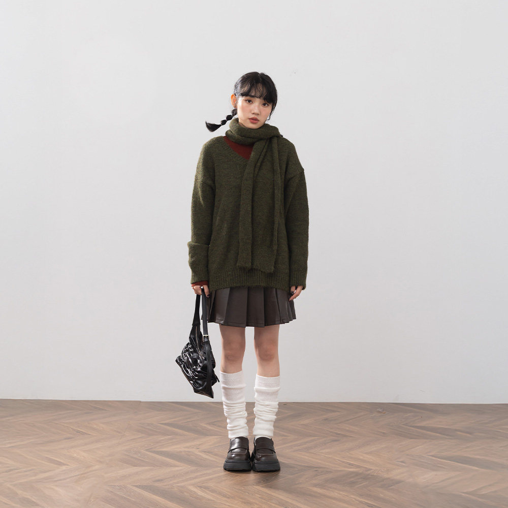 QUEENSHOP 2025秋冬新品女装V领花纱设计附围巾针织毛衣01071237
