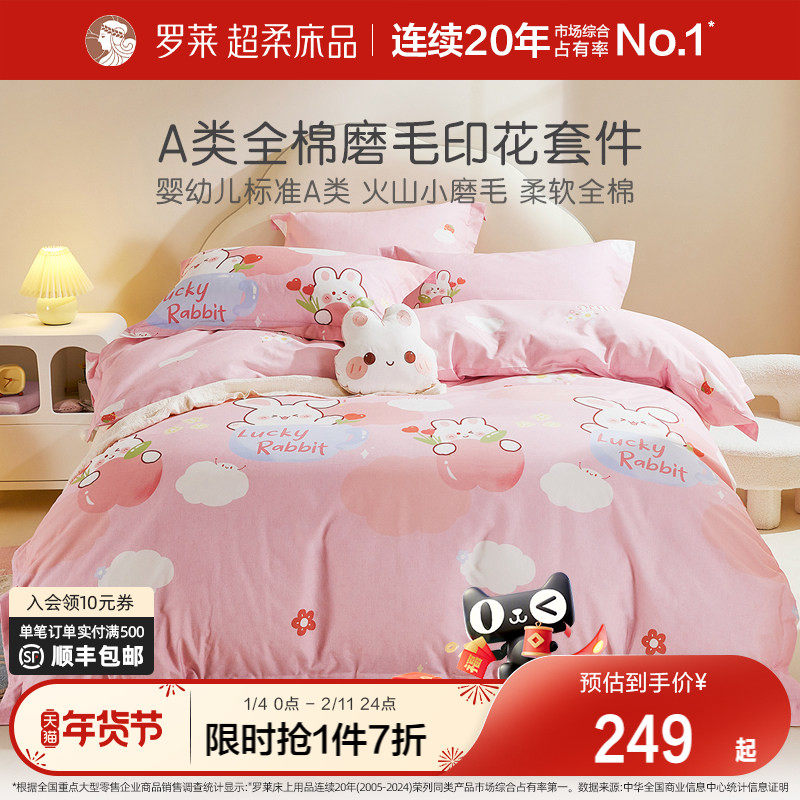 罗莱家纺儿童床品磨毛四件套全棉纯棉床单被套床笠女生宿舍三件套