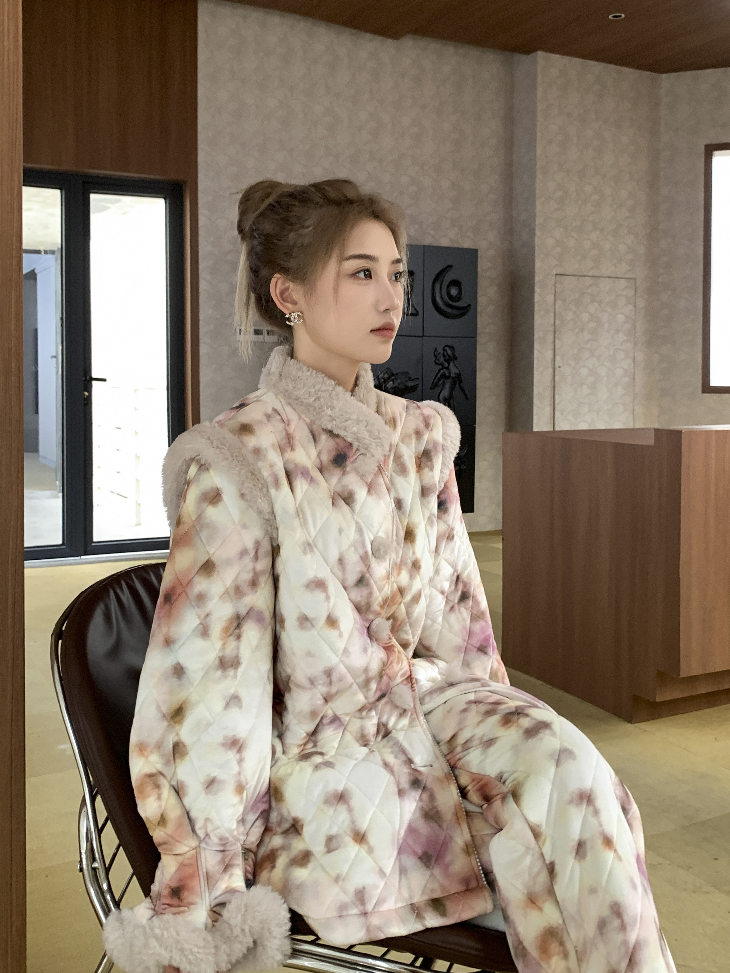 夕拾琥珀冬季三层夹棉加绒加厚可外穿女士睡衣套装