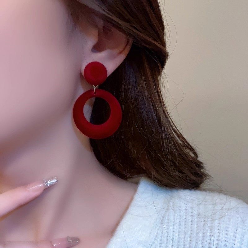 秋冬百搭新款复古丝绒红绿撞色气质耳环港风几何圈圈耳钉耳饰玫瑰