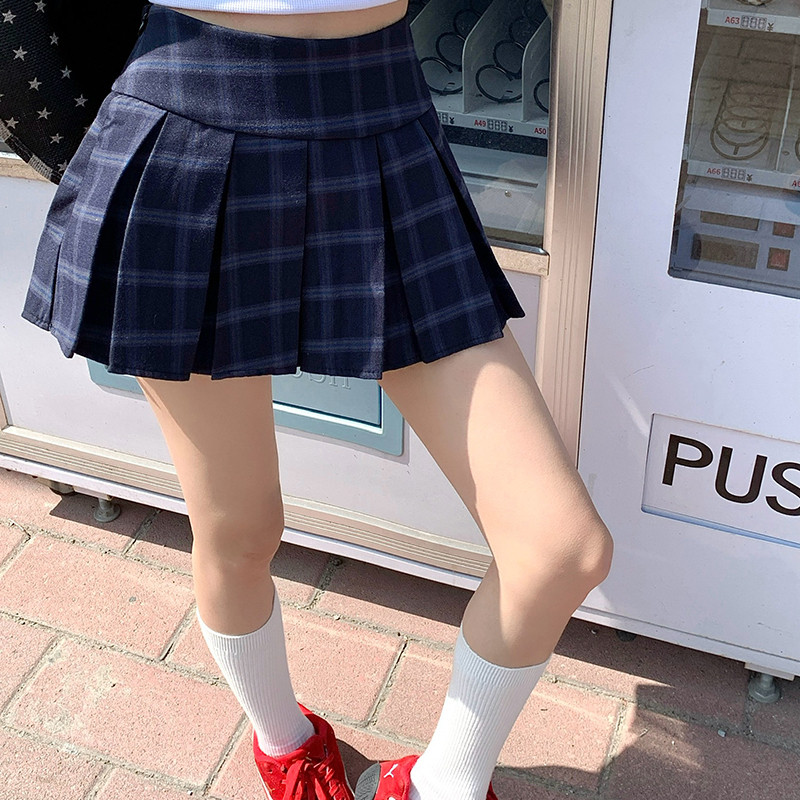 大码美式复古蓝格纹百褶半身裙女夏高腰显瘦a字裙胖mm遮胯短裙子