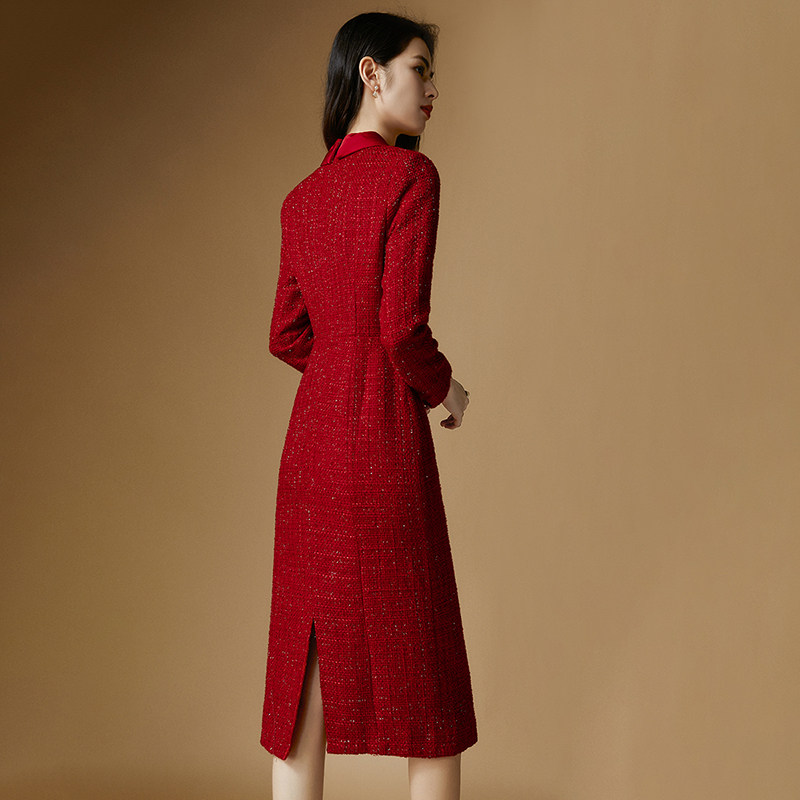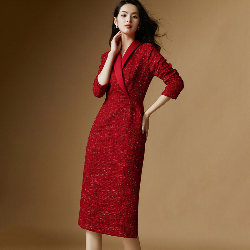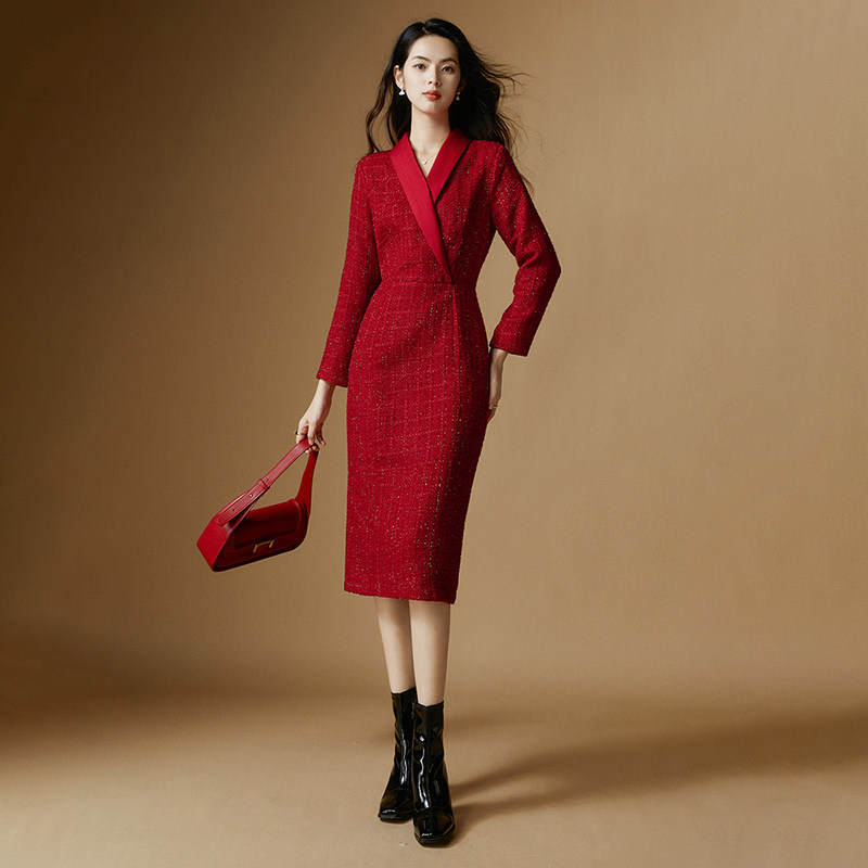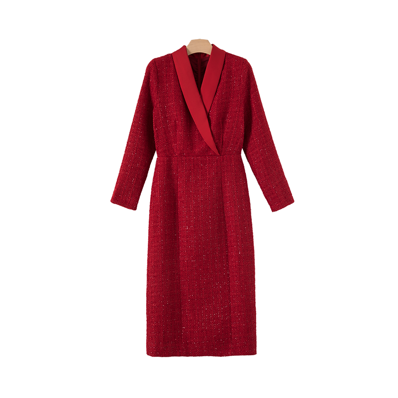 晚白2025秋冬新款修身气质新年红色小香风粗花呢长袖礼服裙连衣裙