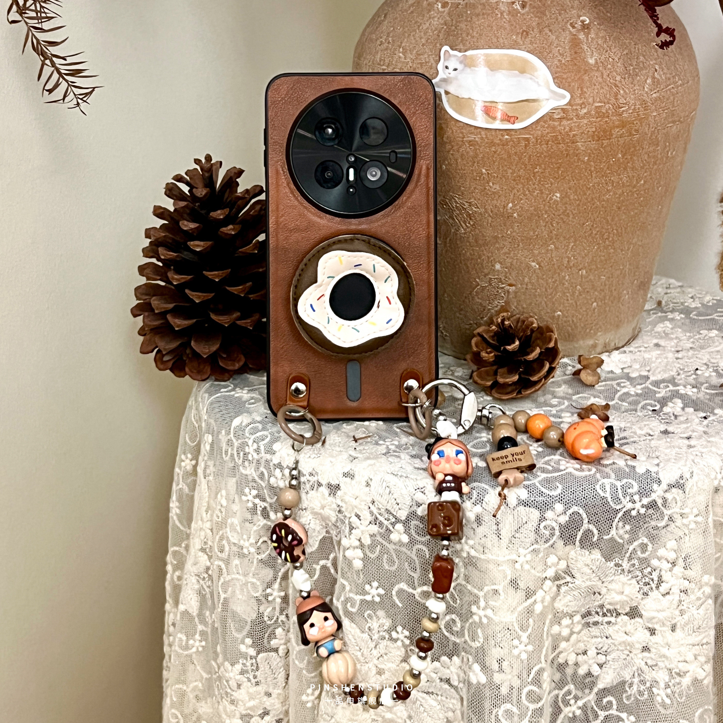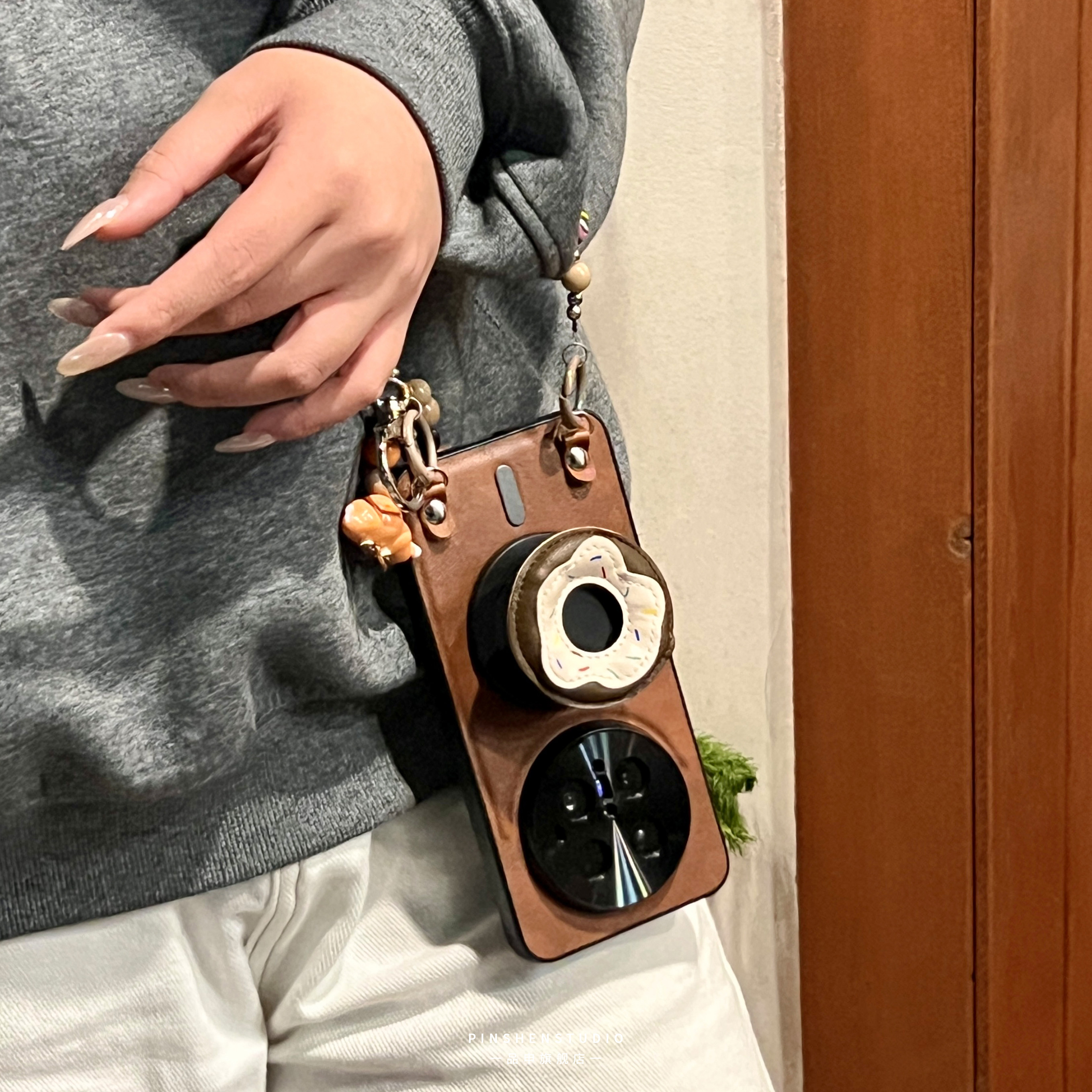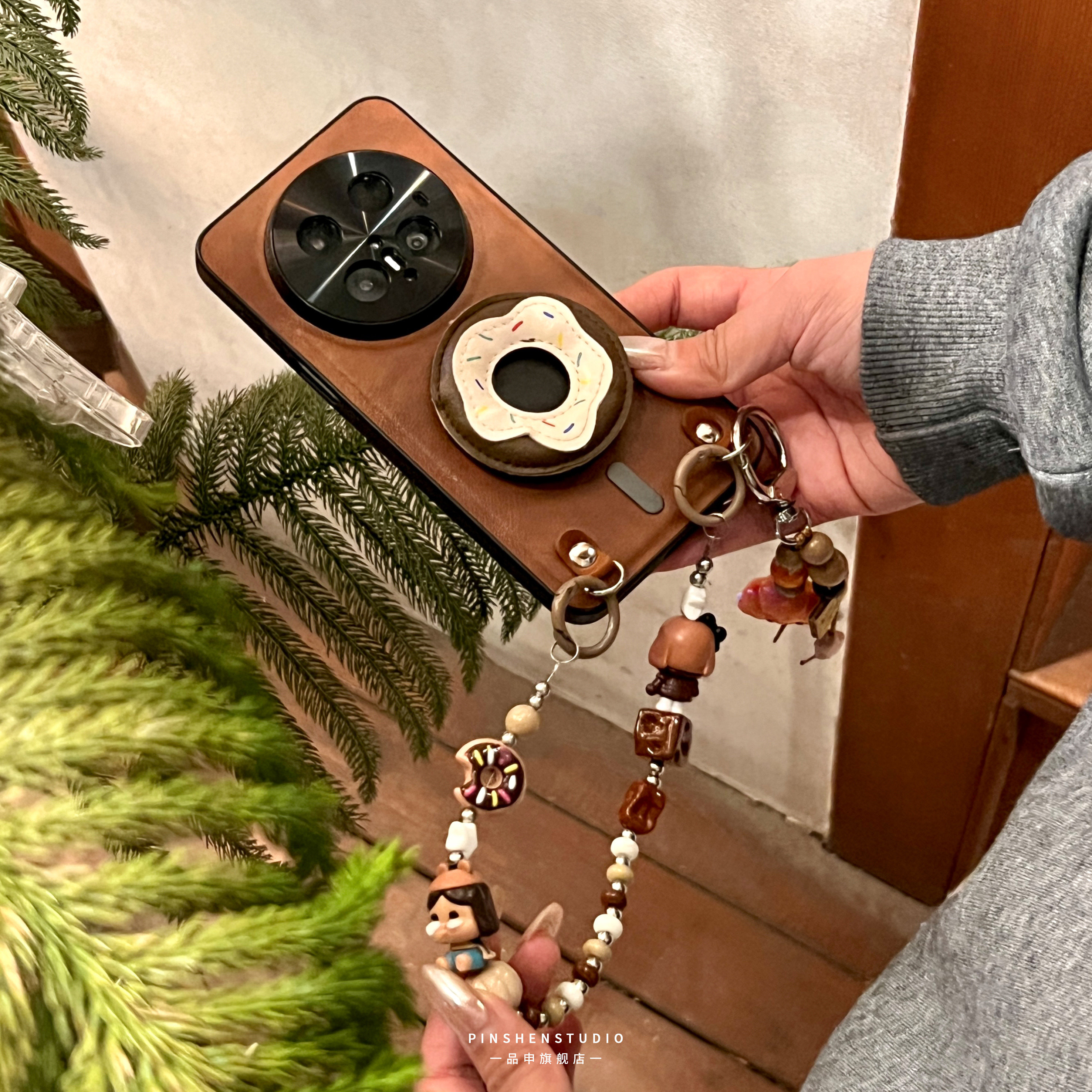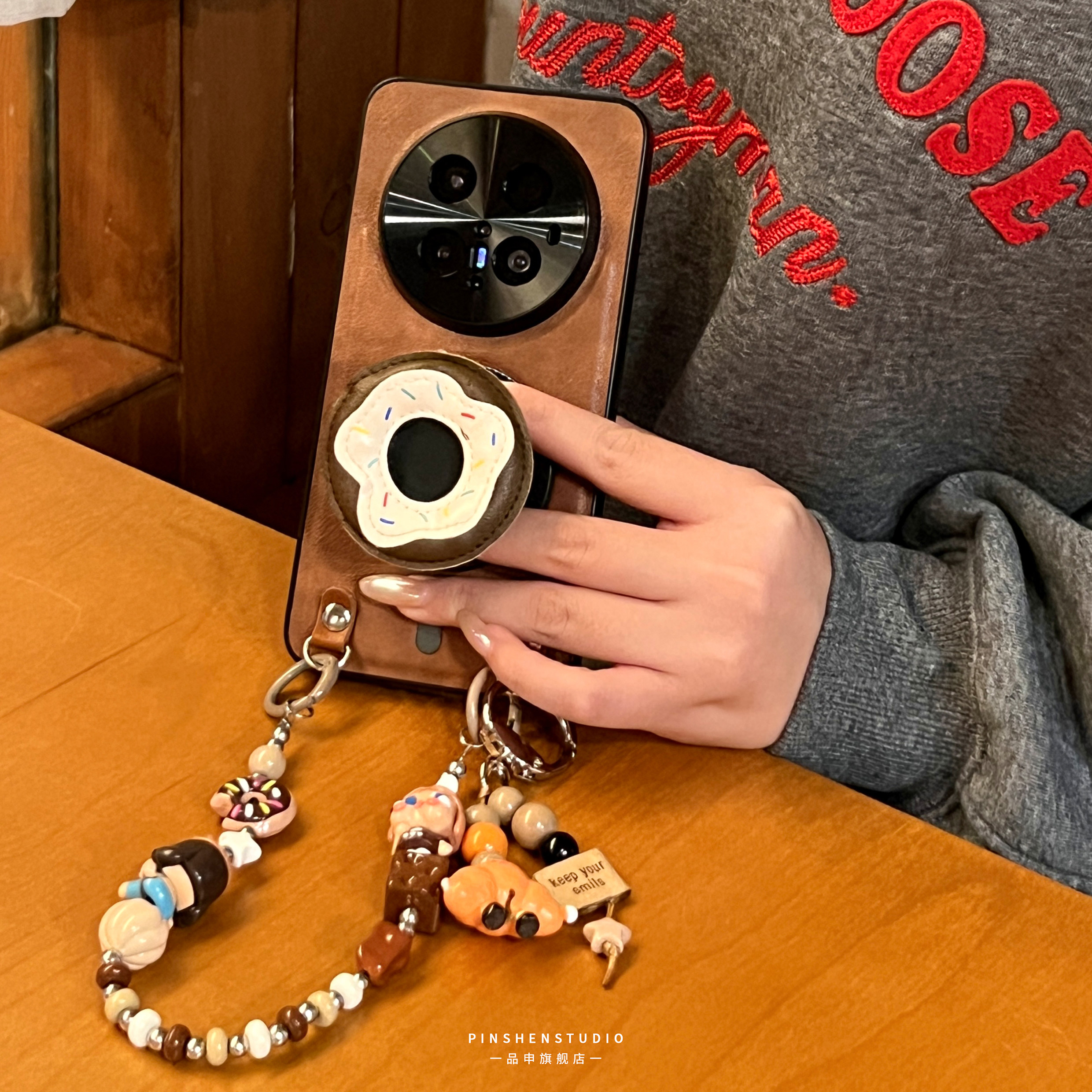 原创摩卡棕皮质甜甜圈磁吸支架手提链手机壳