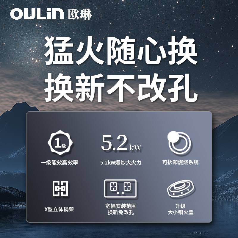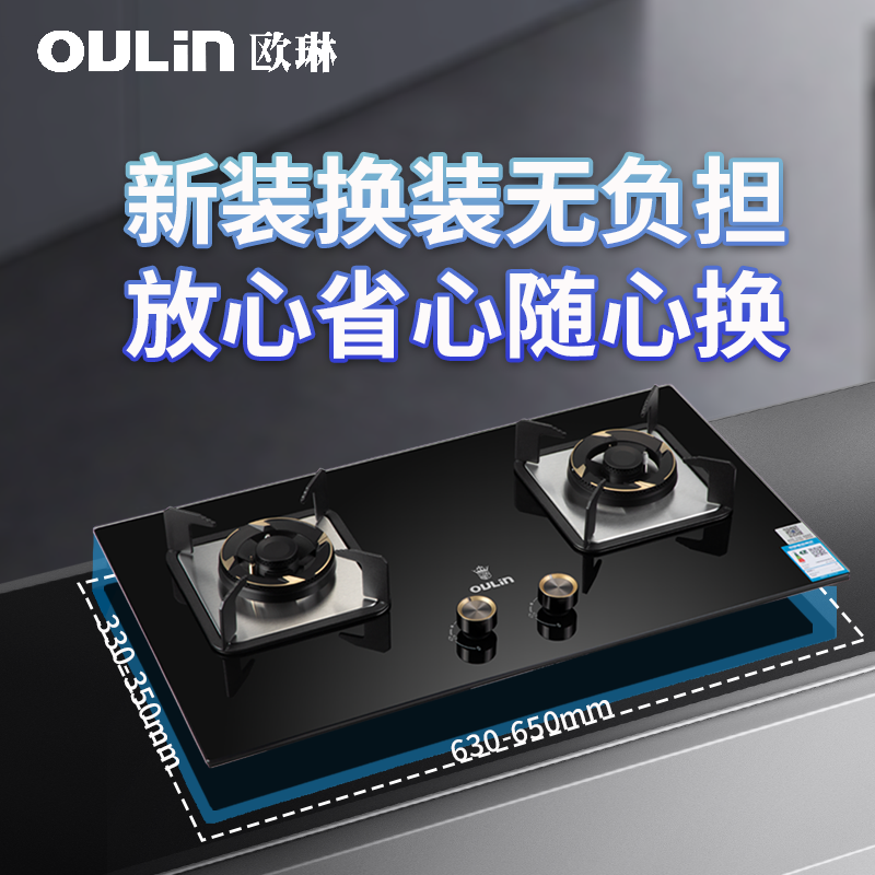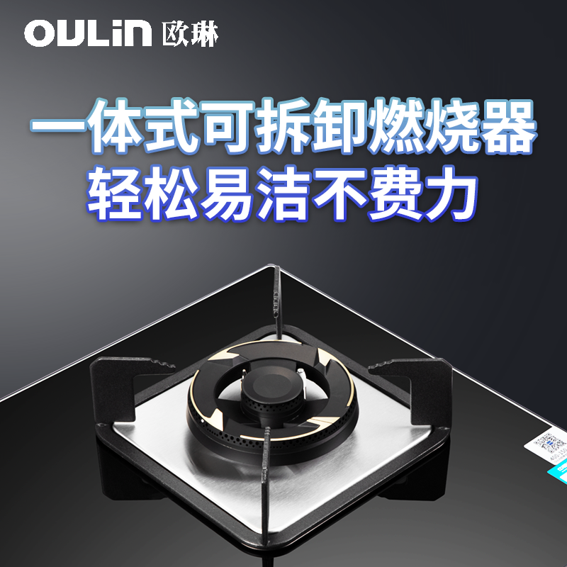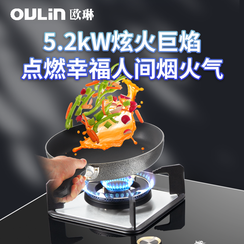 欧琳5.2Kw大火力灶具家用猛火全铜火盖钢化玻璃燃气灶E2003B