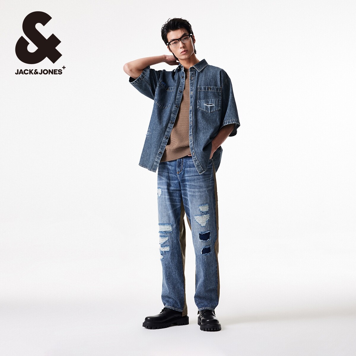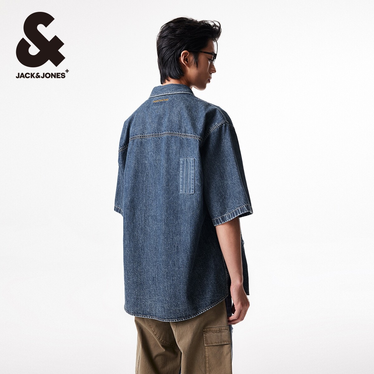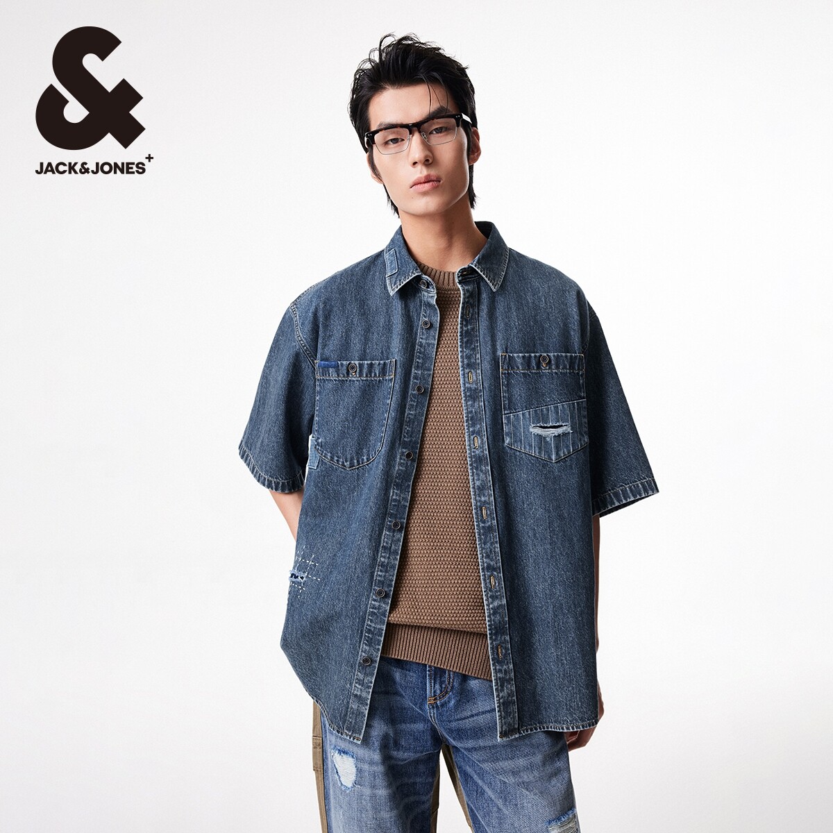 【大师牛仔】杰克琼斯夏季宽松做旧磨破字母刺绣牛仔短袖衬衫男装