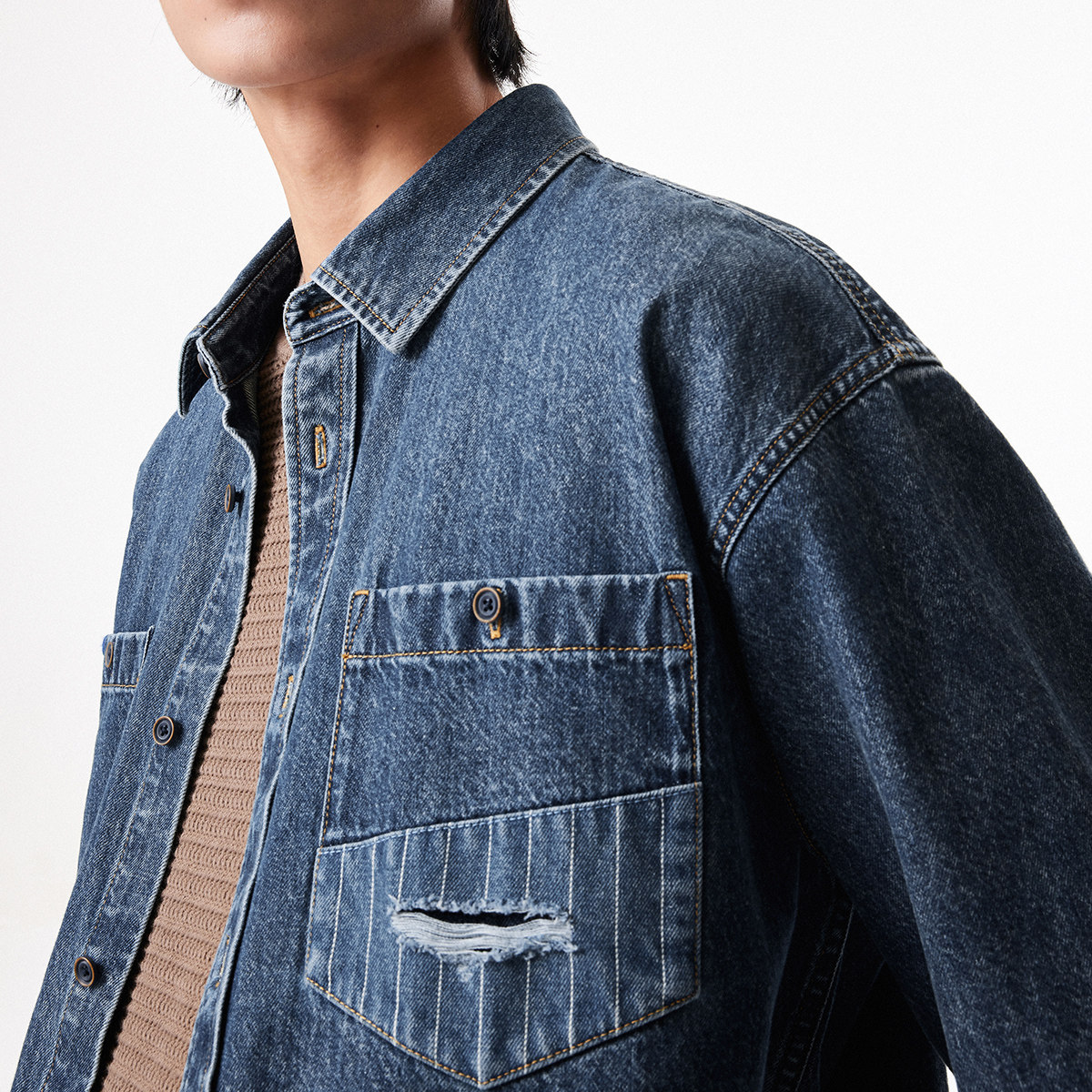 宽松版型 翻领领型 做旧磨破装饰