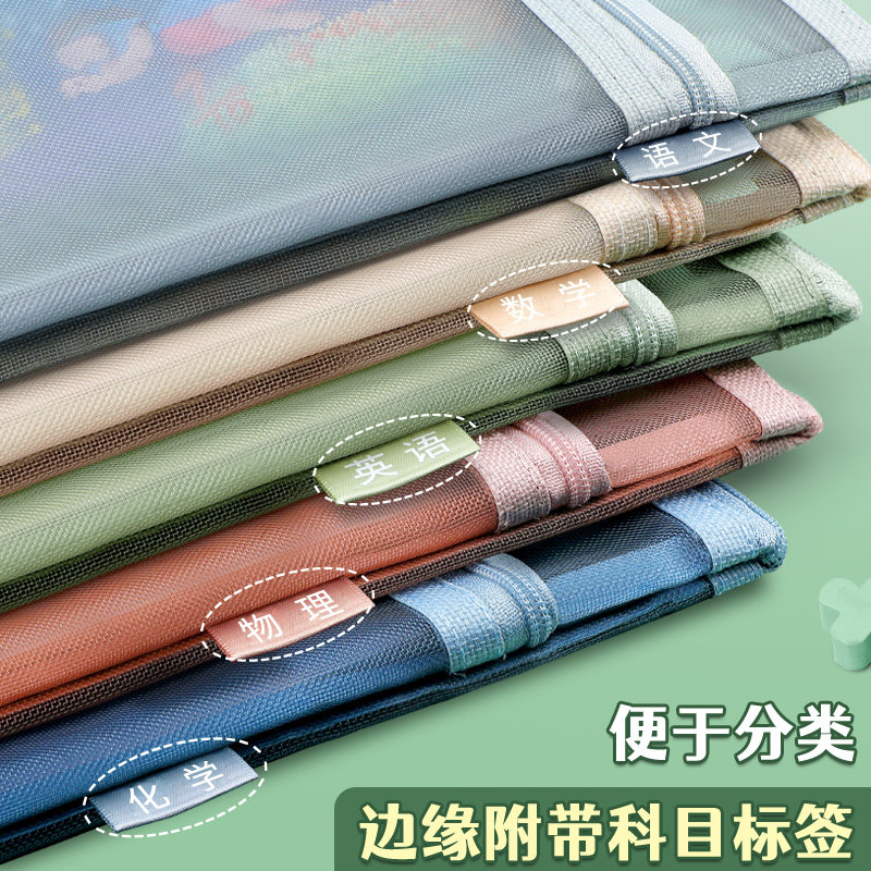 科目分类文件袋透明拉链式a4收纳拎书课外班作业男女孩书包小学初中生l型考试试卷学科补习网纱手提袋大容量