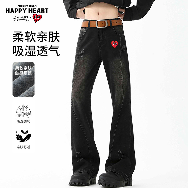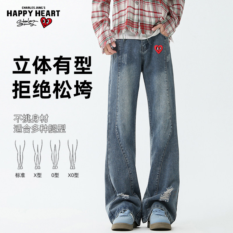 查尔斯桃心 美式复古破洞水洗牛仔裤男2025年春秋季直筒休闲长裤