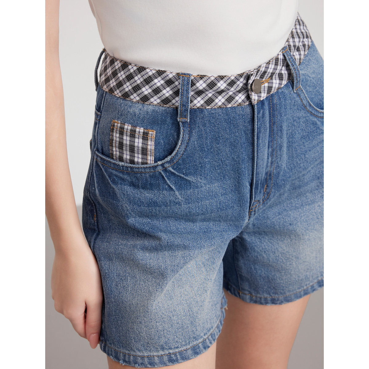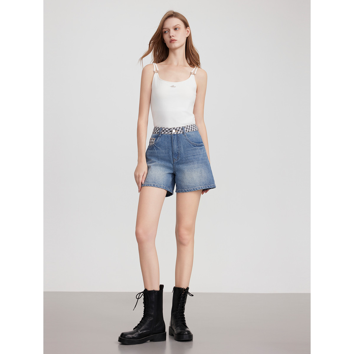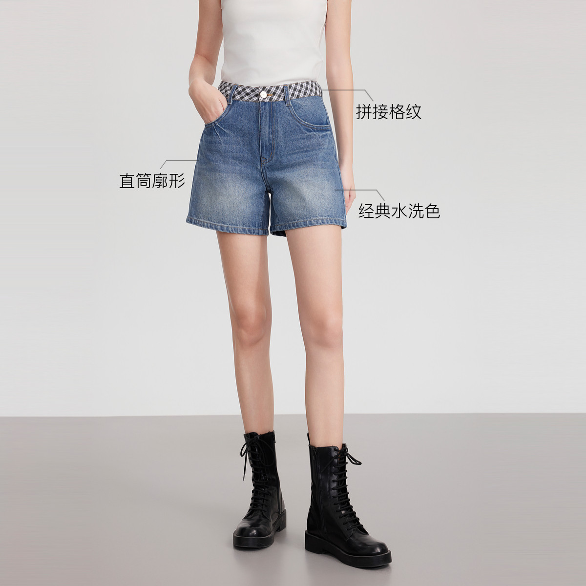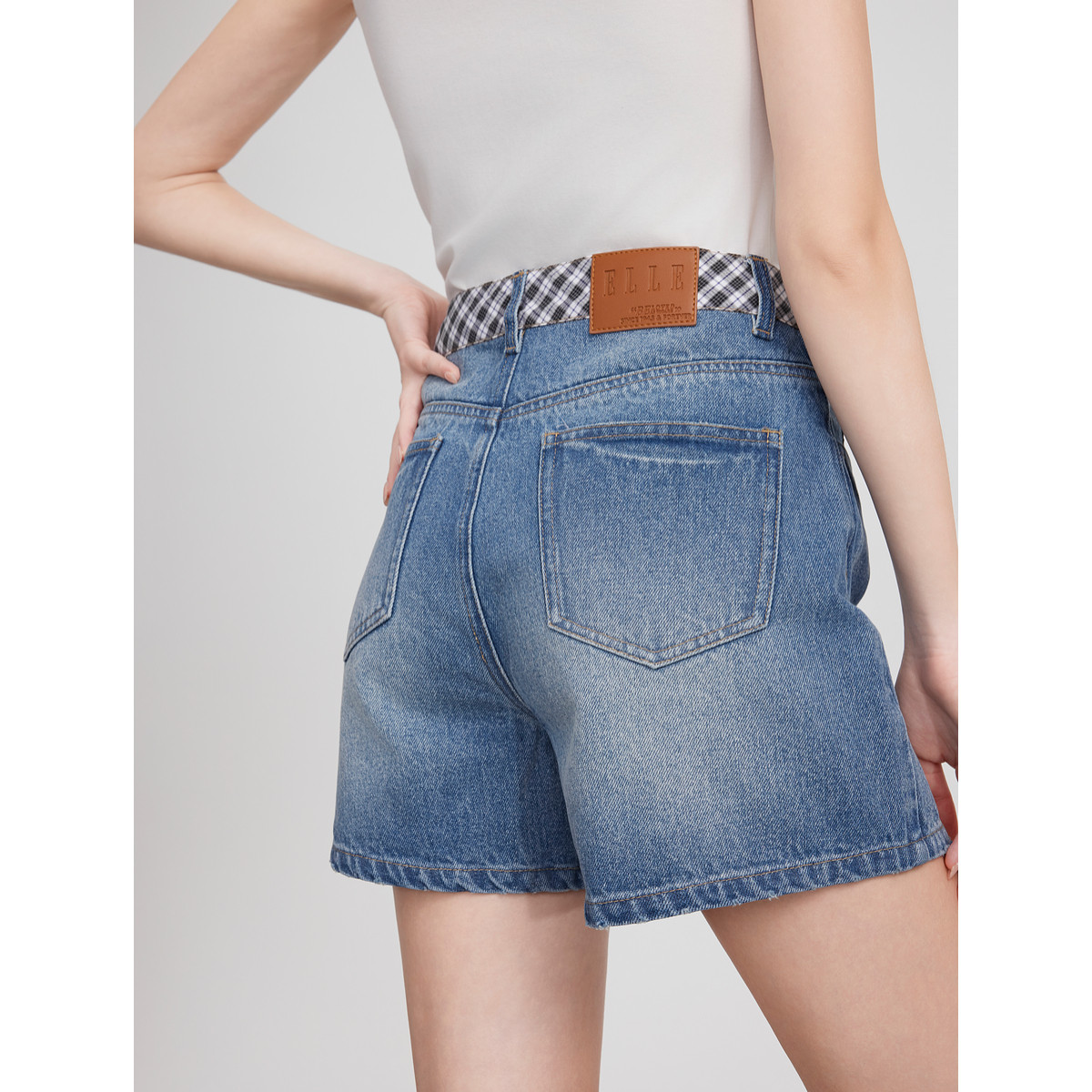 ELLE法式拼接设计感牛仔短裤女2025夏季新款时尚优雅通勤阔腿裤子