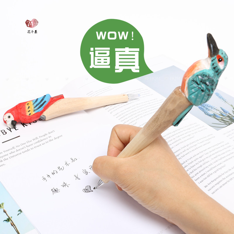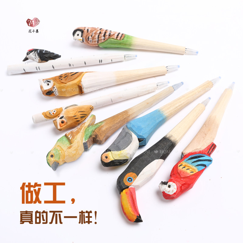 创意手工实木雕刻中性笔动物百鸟碳素水笔文具纪念送同学礼物摆件