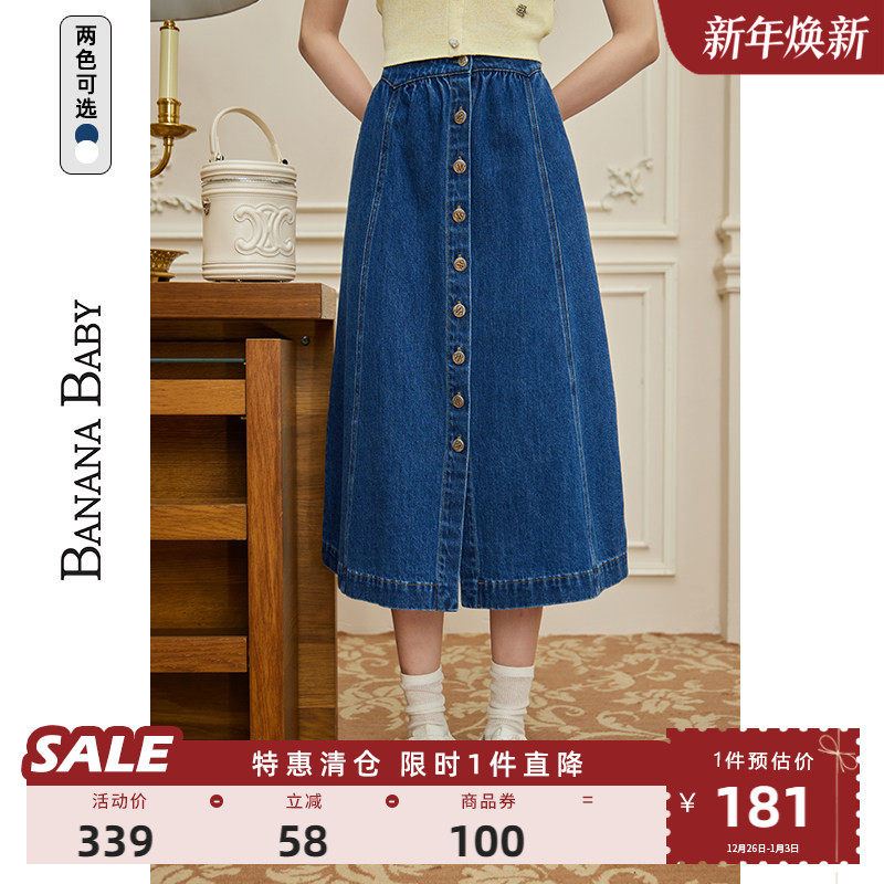 BANANA BABY2025新款A字牛仔半身裙女高腰单排扣中长裙