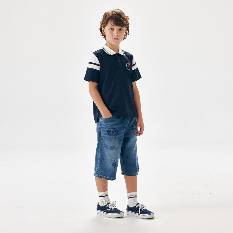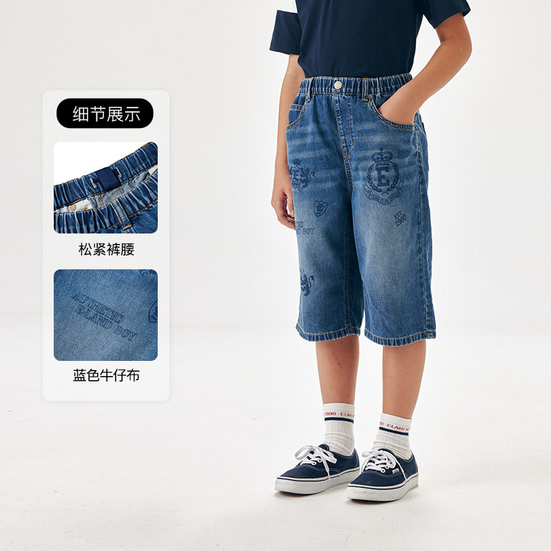 eland kids衣恋童装男童短裤夏季学院风徽章印花复古牛仔裤七分裤