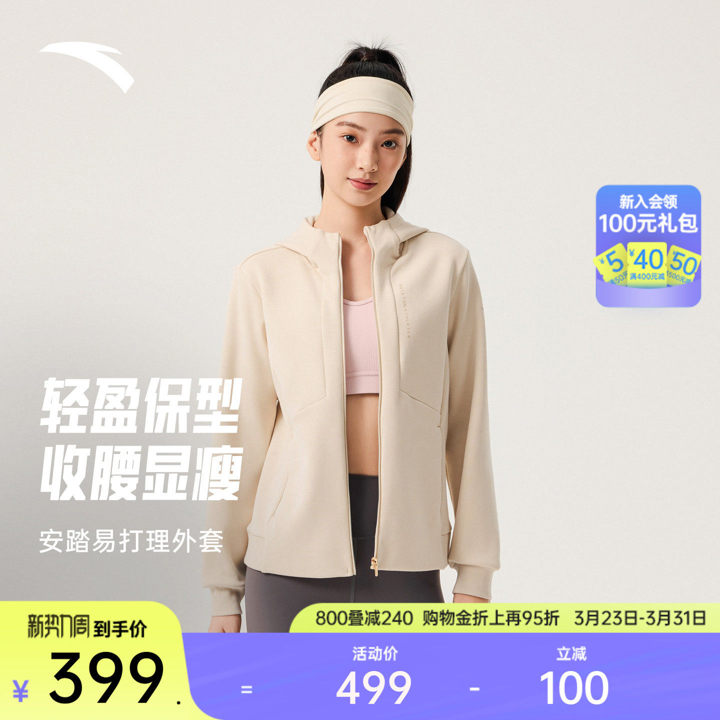 安踏易打理外套丨女子保暖开衫修身训练连帽运动服上衣162547711N