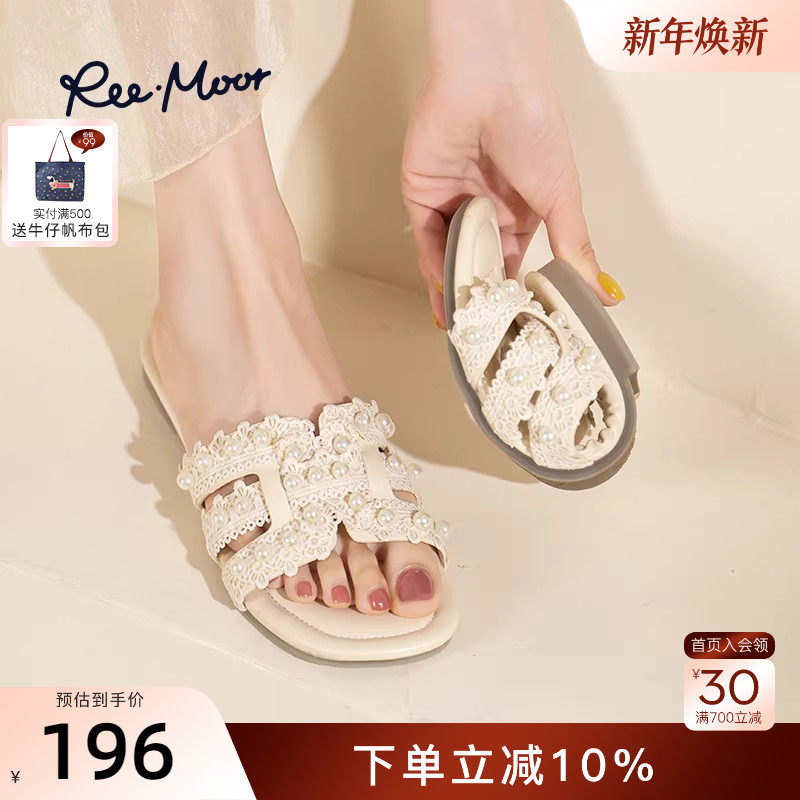 REEMOOR睿慕2025夏季新款平底拖鞋女仙女晚晚风珍珠蕾丝一字拖