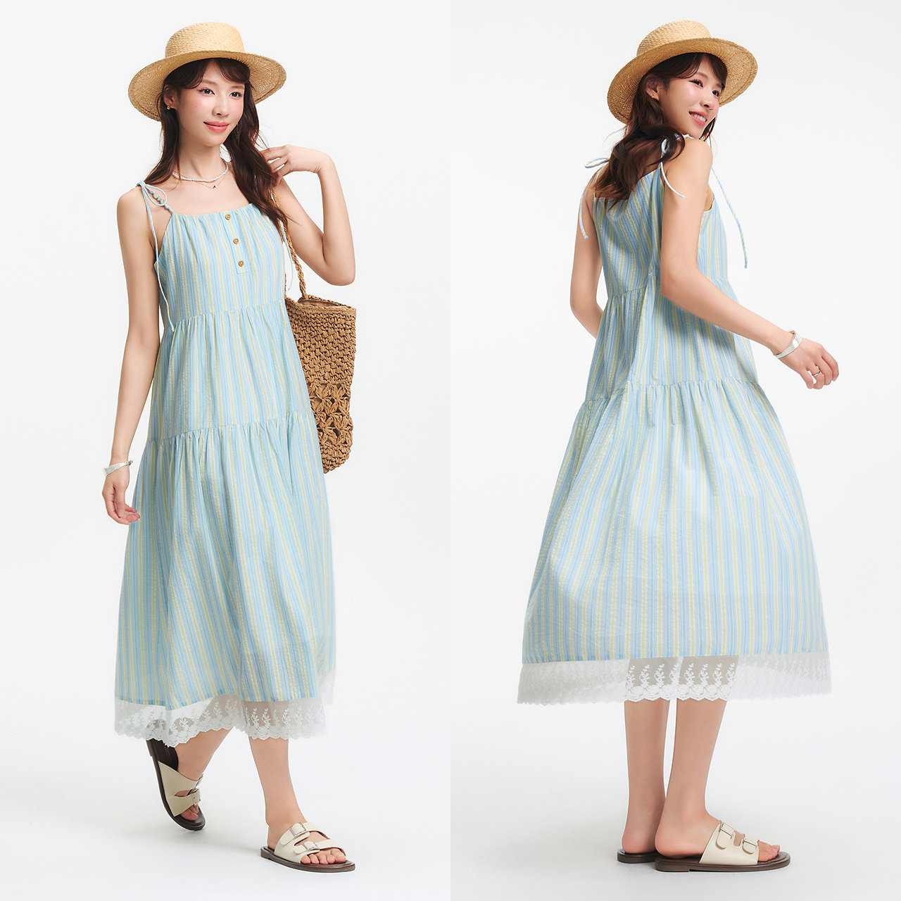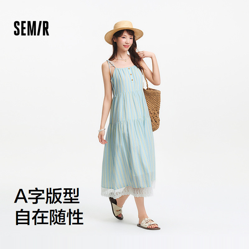 森马连衣裙女肌理条纹蛋糕裙甜美元气2025新款夏度假风蕾丝吊带裙