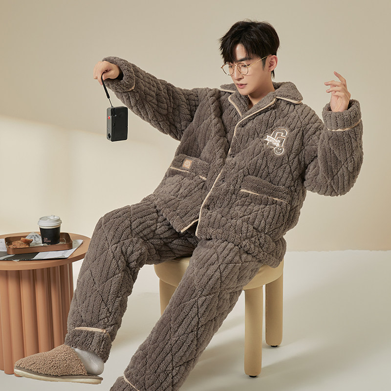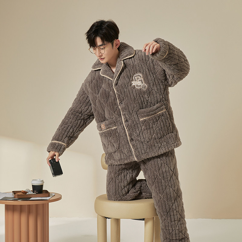 冬季珊瑚绒男士睡衣三层夹棉加厚加绒法兰绒秋冬款家居服保暖套装