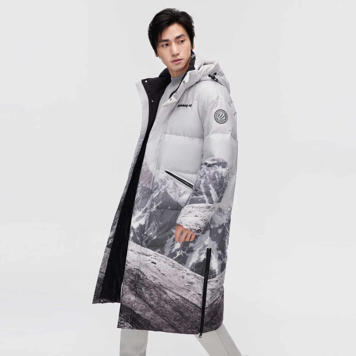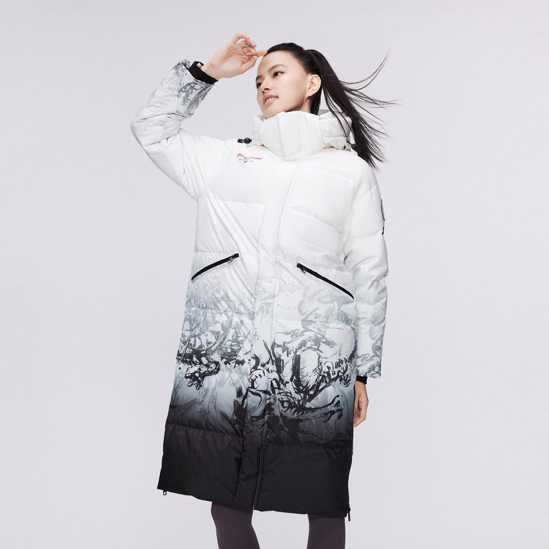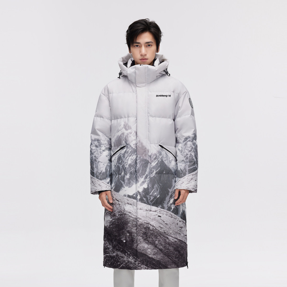 波司登奥莱冬男女同款水墨山水时尚运动雪山图案长款连帽厚羽绒服