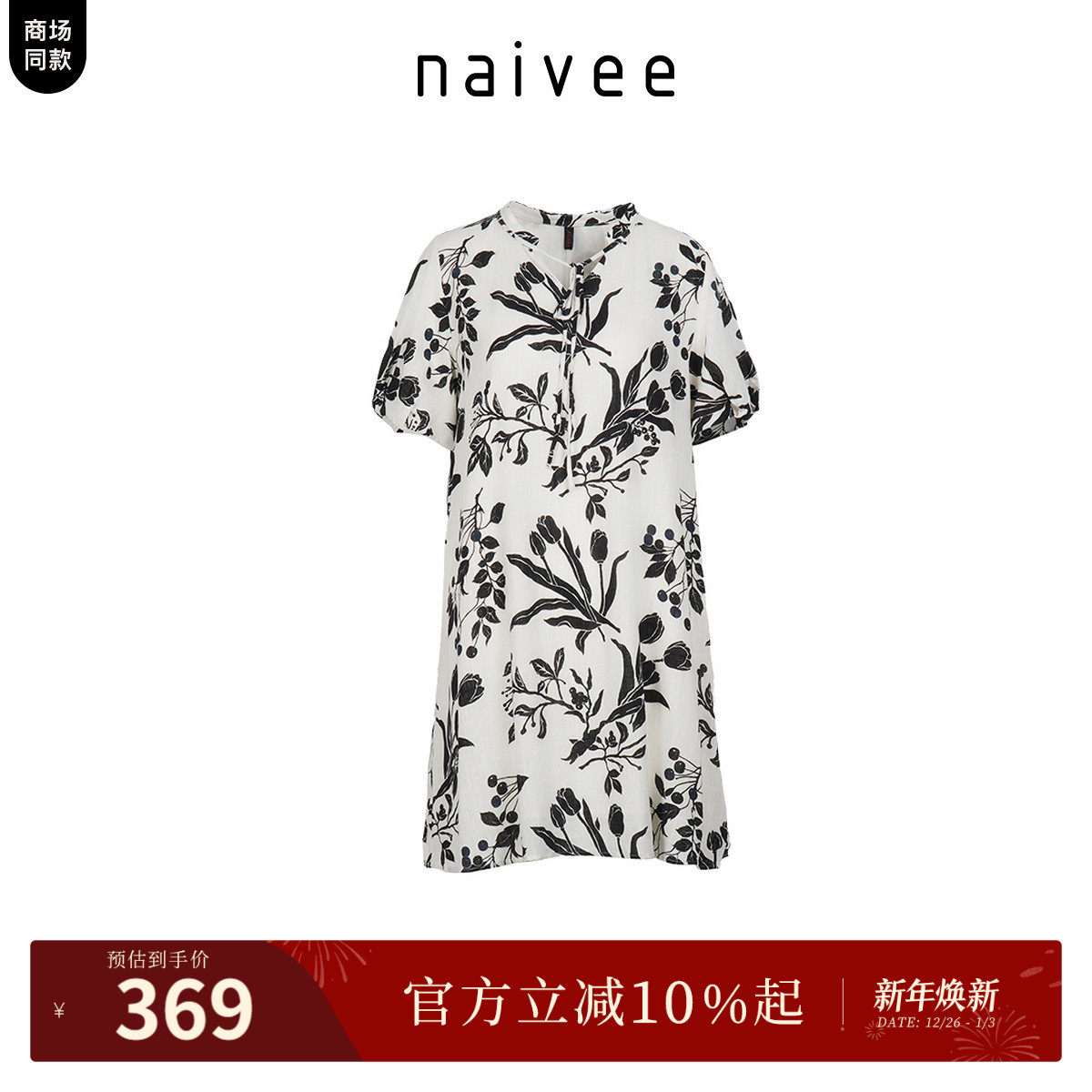 naivee秋款亚麻混纺墨色印花连衣裙V领系带度假风