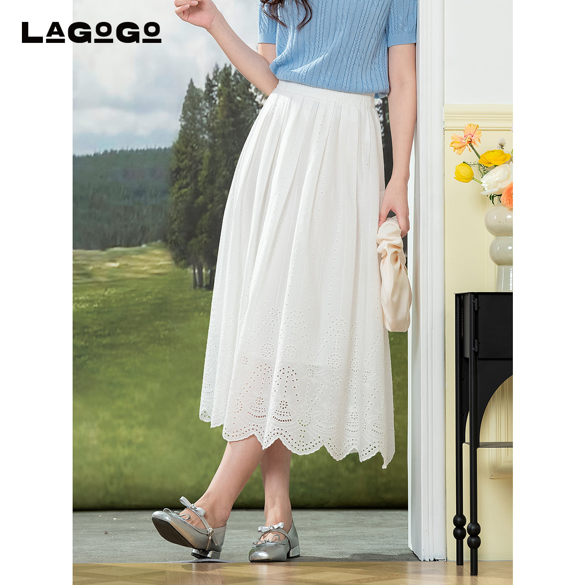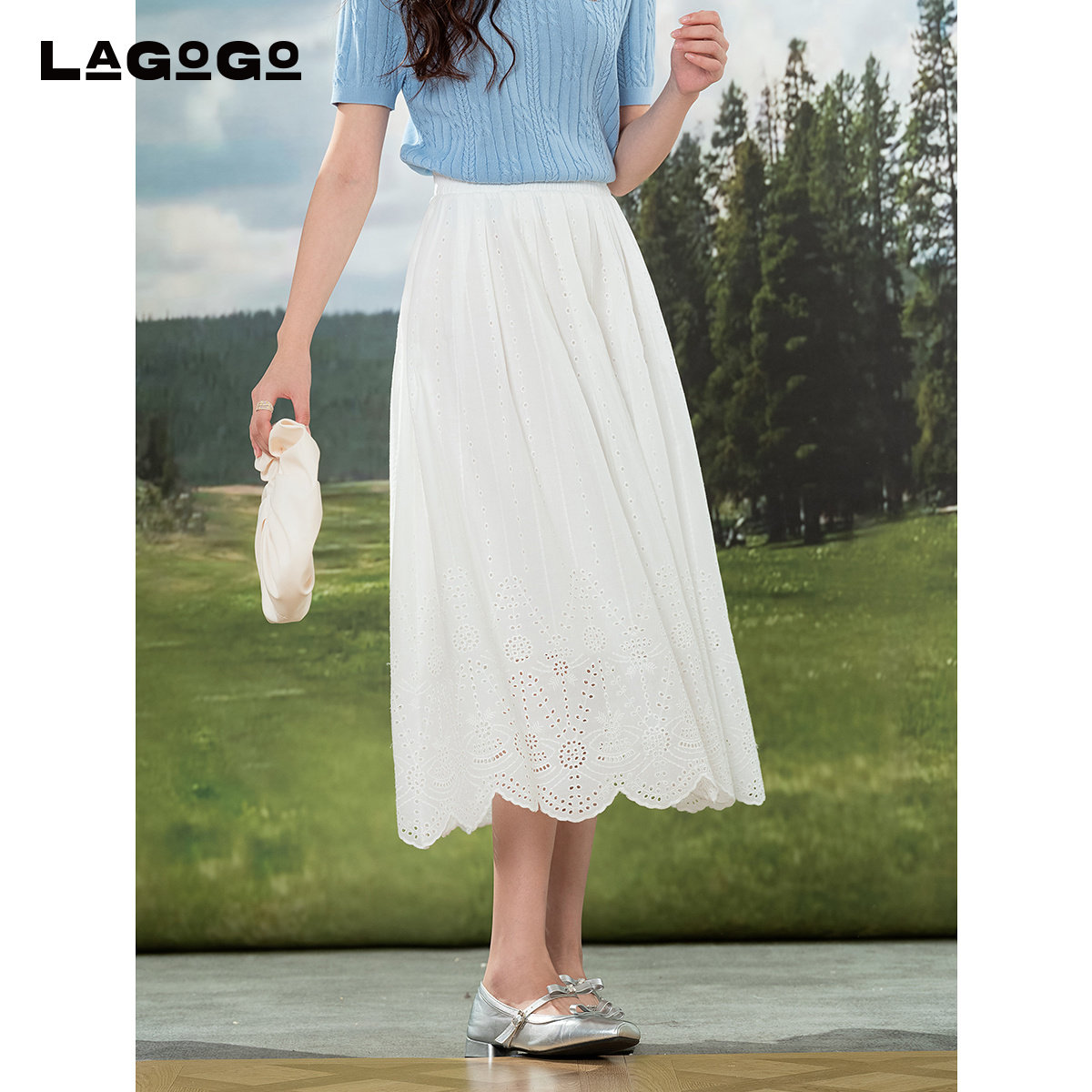 LAGOGO白色纯棉镂空刺绣半身裙女拉谷谷2025夏季新款高腰百搭裙子