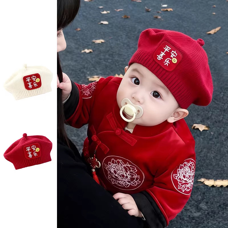 婴幼儿红色帽子秋冬季男女宝宝贝雷帽可爱超萌新年红色毛线帽针织