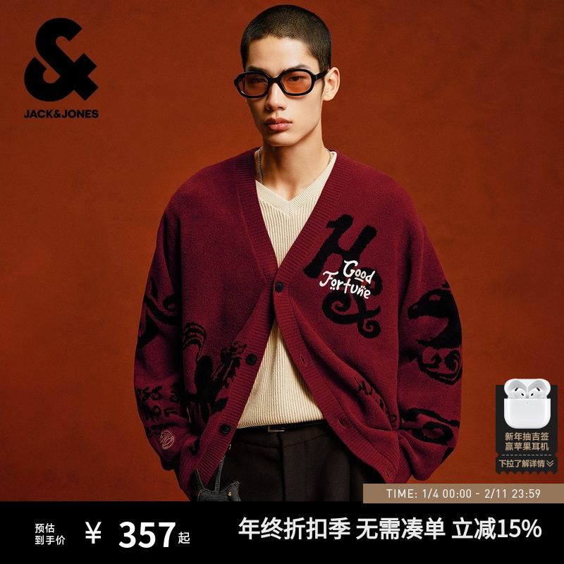 [马年新年款]杰克琼斯男装红色雪尼尔混纺毛衣暗纹刺绣宽松针织衫