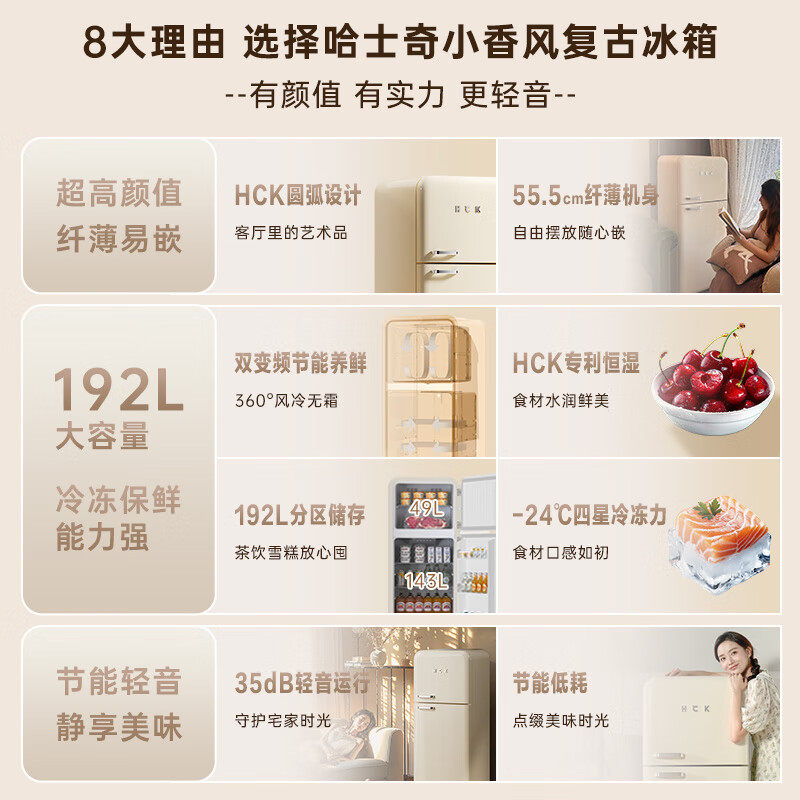 HCK哈士奇小香风SE复古冰箱双变频节能双门客厅无霜家用保鲜冷冻