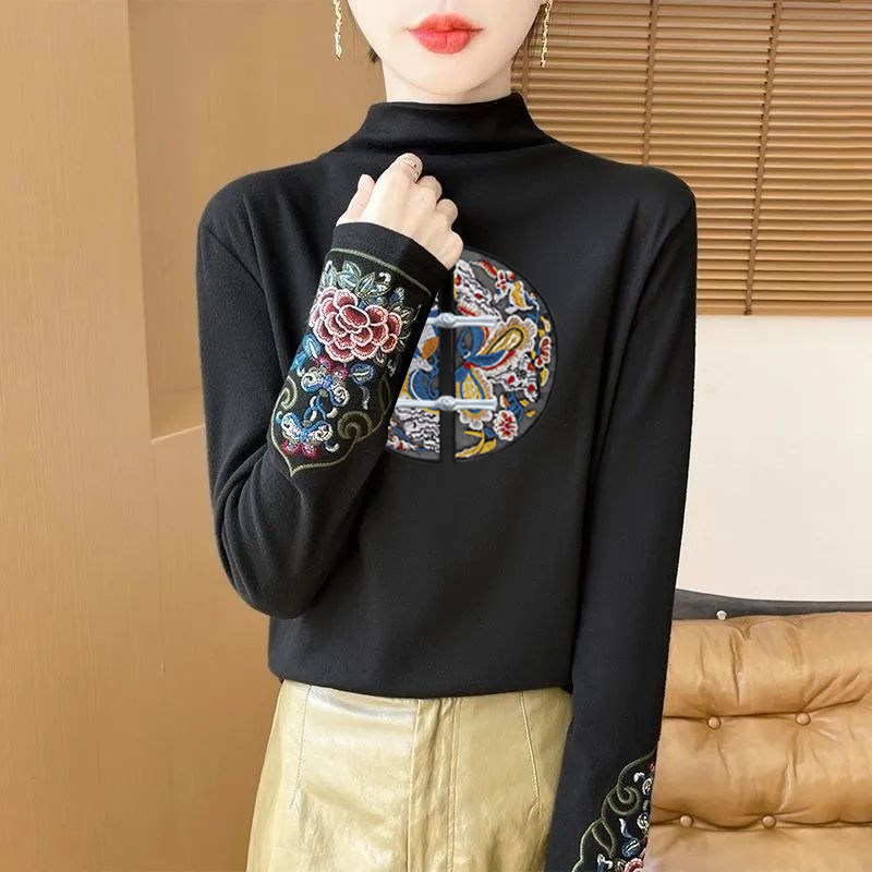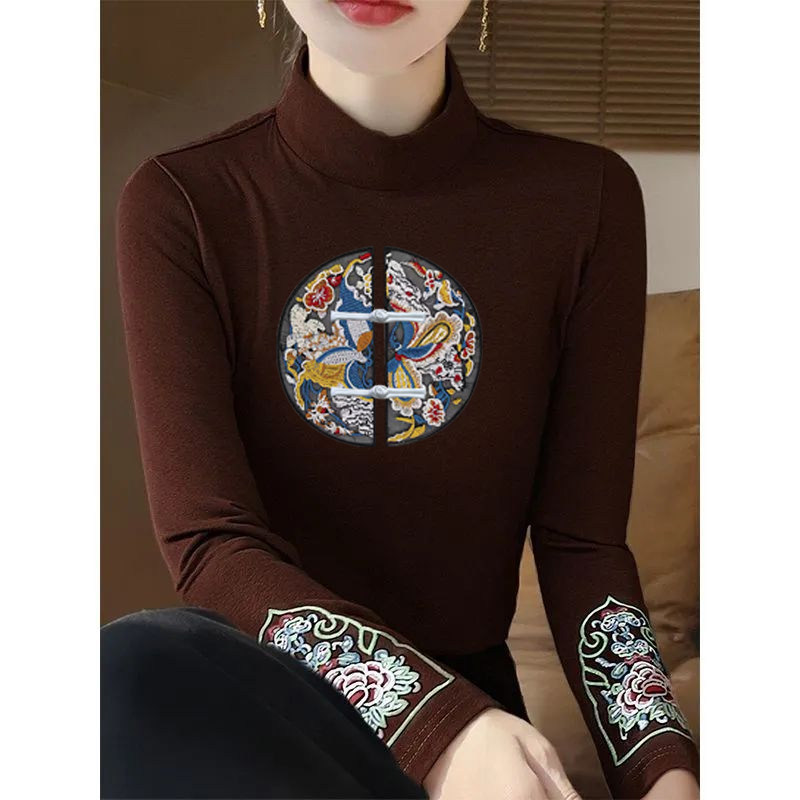 秋冬半高领德绒打底衫女复古民族风长袖中式T恤国风印花保暖上衣