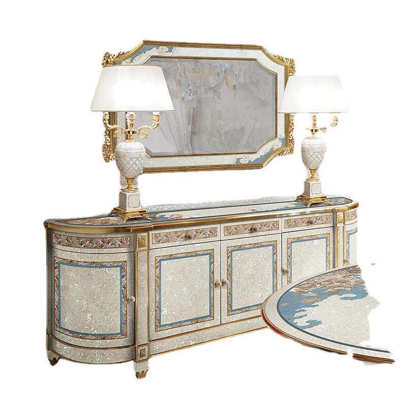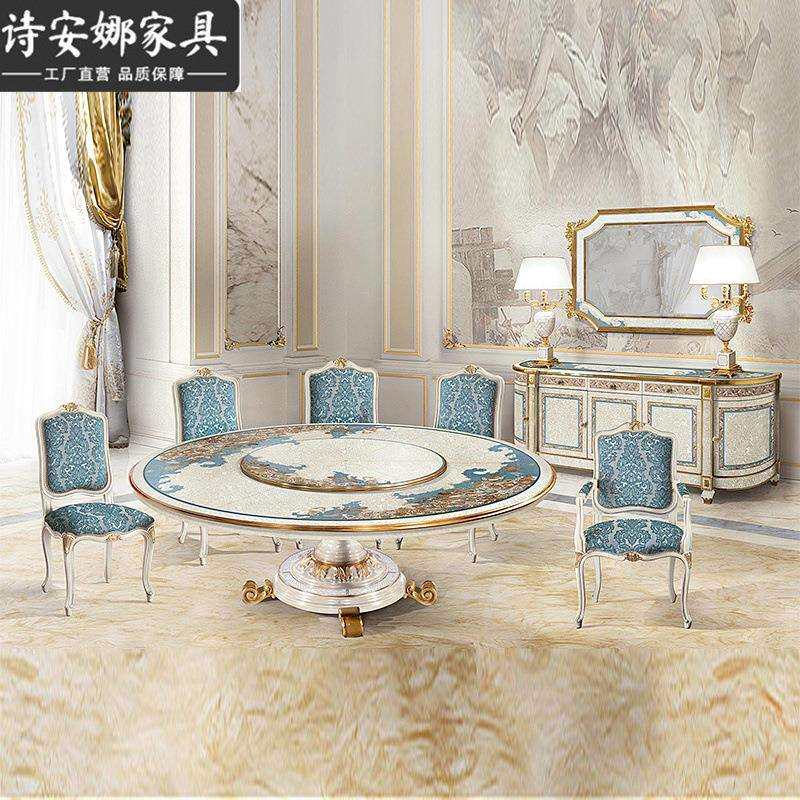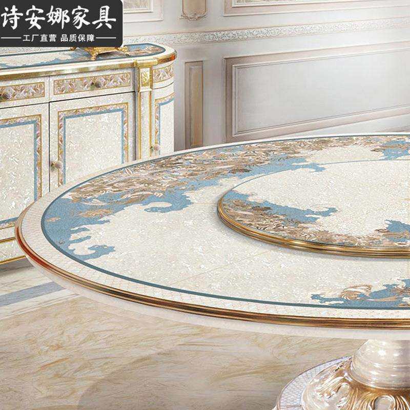 意大利法式奢华欧式实木雕花镶嵌贝壳艺术拼花圆餐桌别墅饭桌餐桌