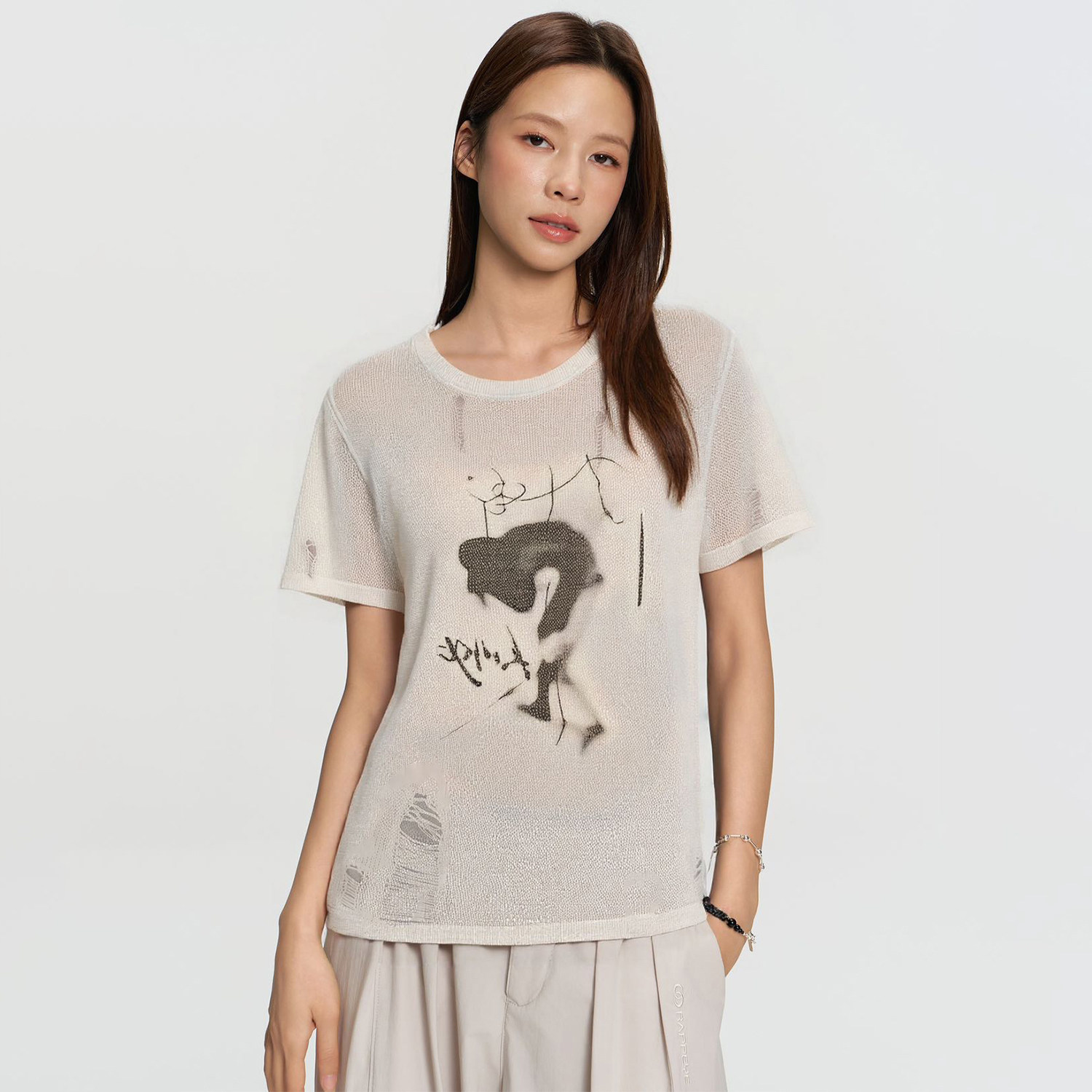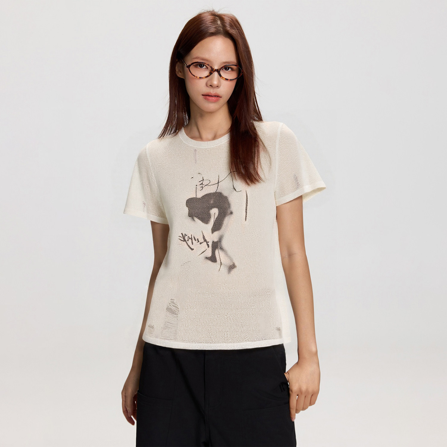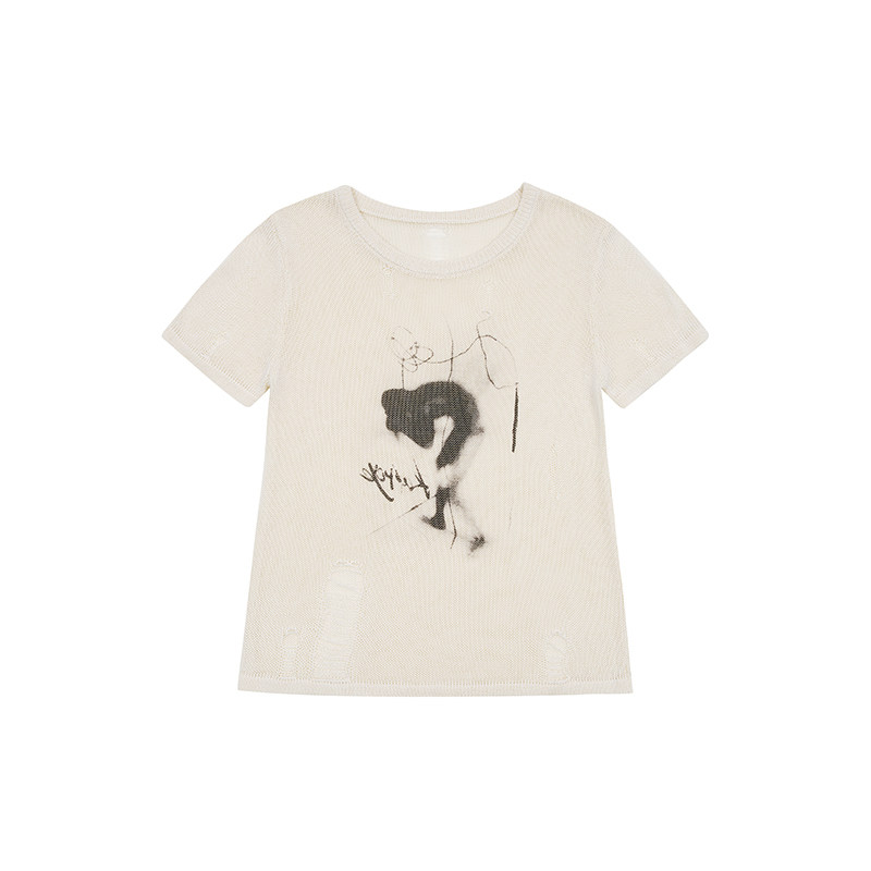 RAPPEYE 百搭不规则圆领夏季镂空破洞针织上衣破坏印花短袖T恤女