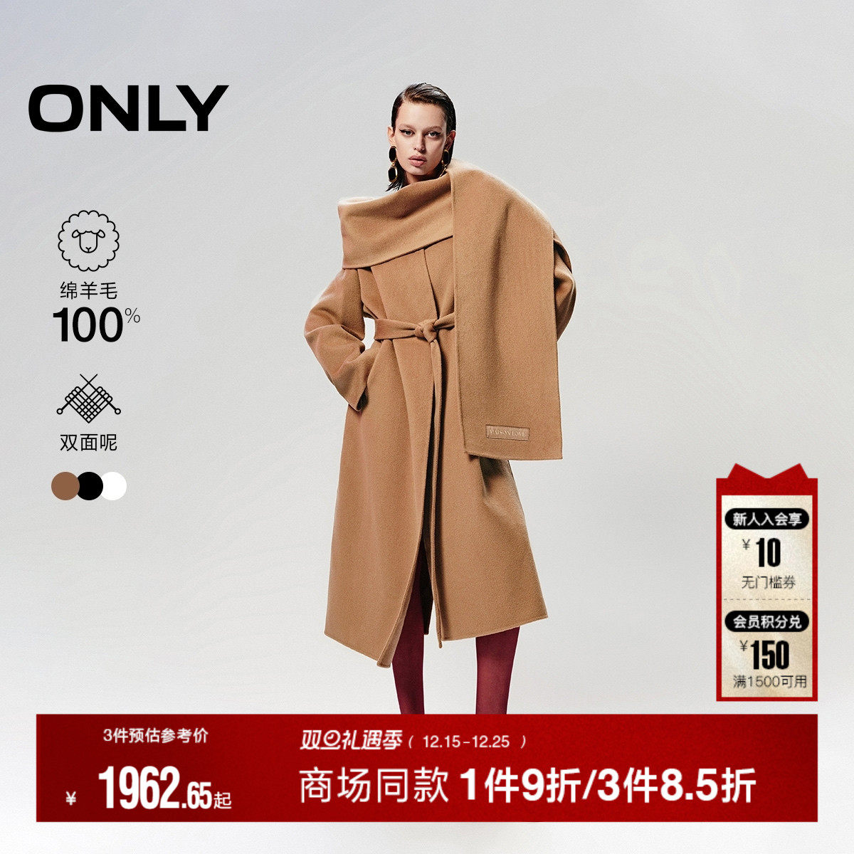ONLY冬季100%绵羊毛质感双面呢收腰长款围巾系带毛呢大衣外套女