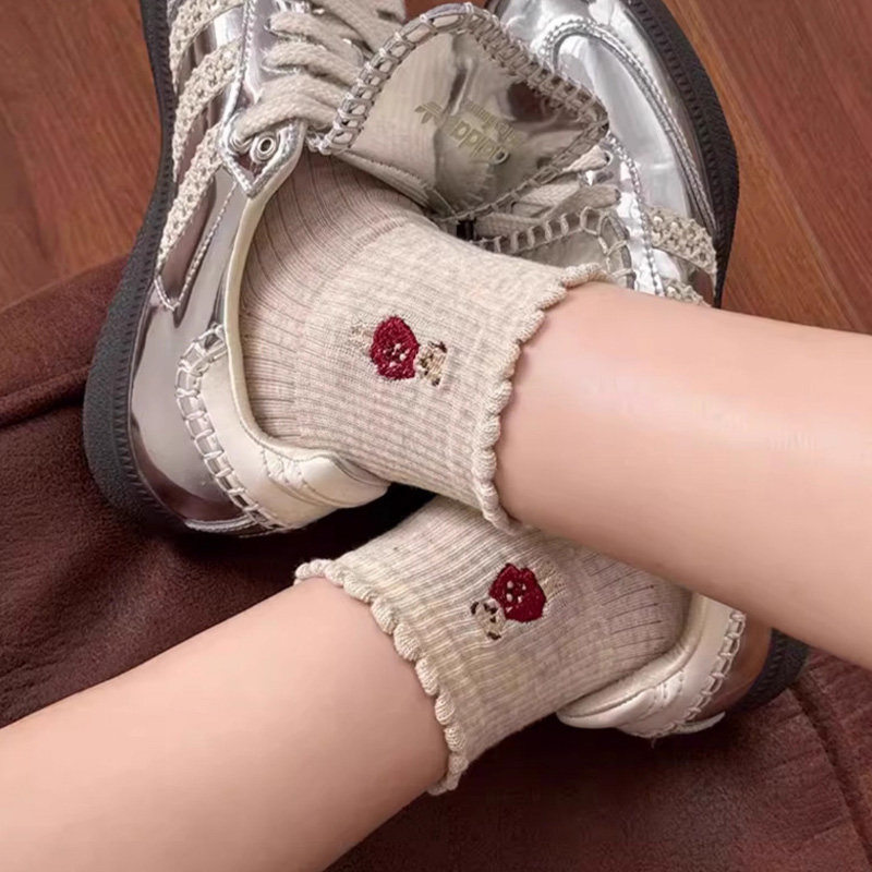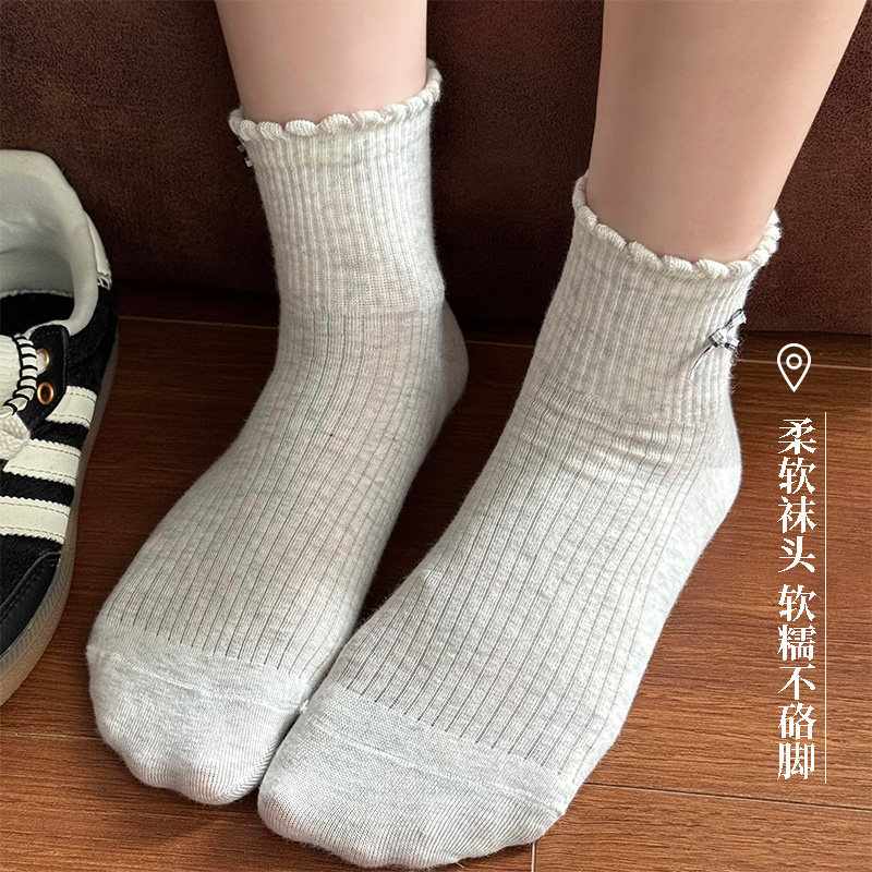 爆款小熊袜子木耳花边蝴蝶结中筒袜纯棉抗菌防臭可爱卡通秋季米色