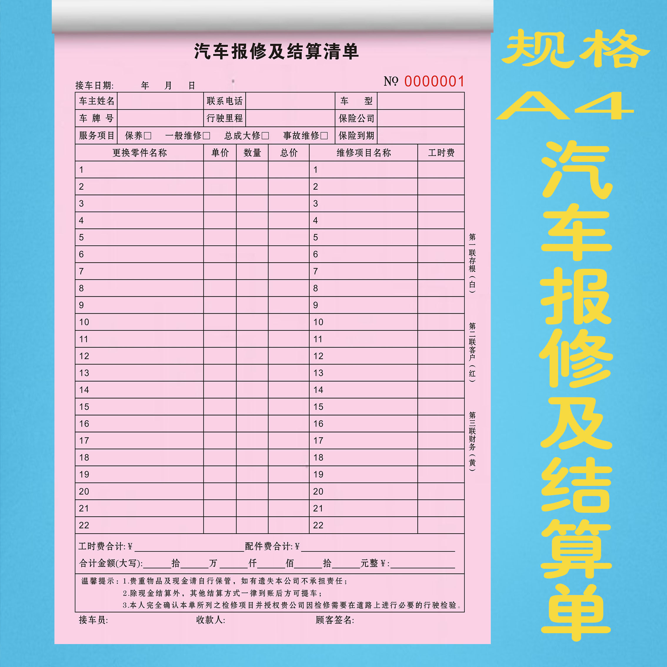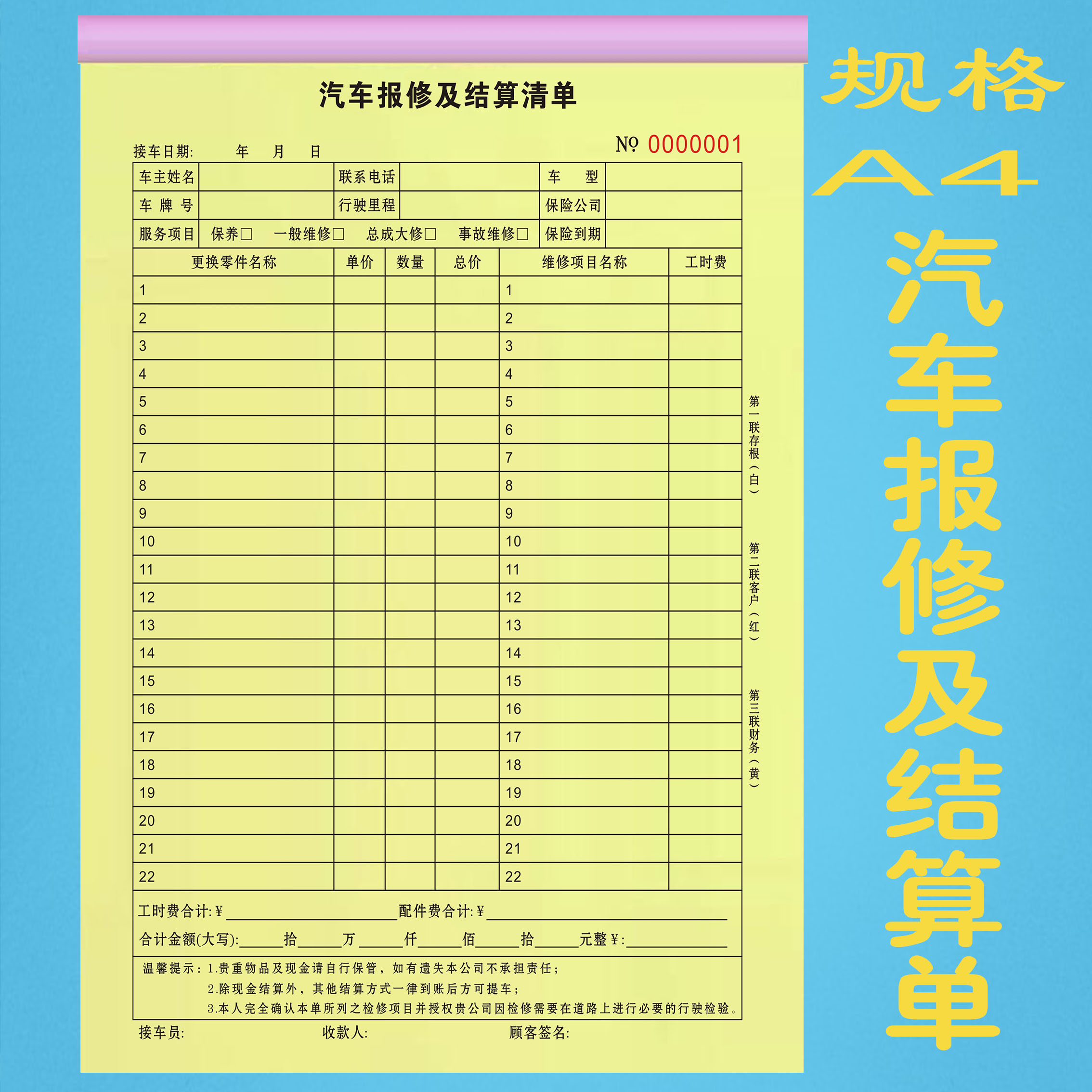 汽车维修结算单4S店车辆报修维修清单报价单汽修厂保养收费明细表