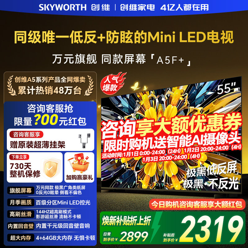 创维黑骑士55A5F+ 55英寸电视机极黑广角类纸屏MiniLED官方旗舰店