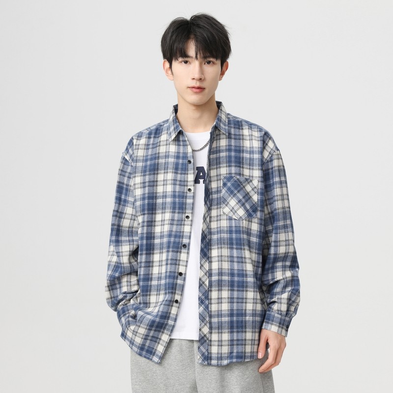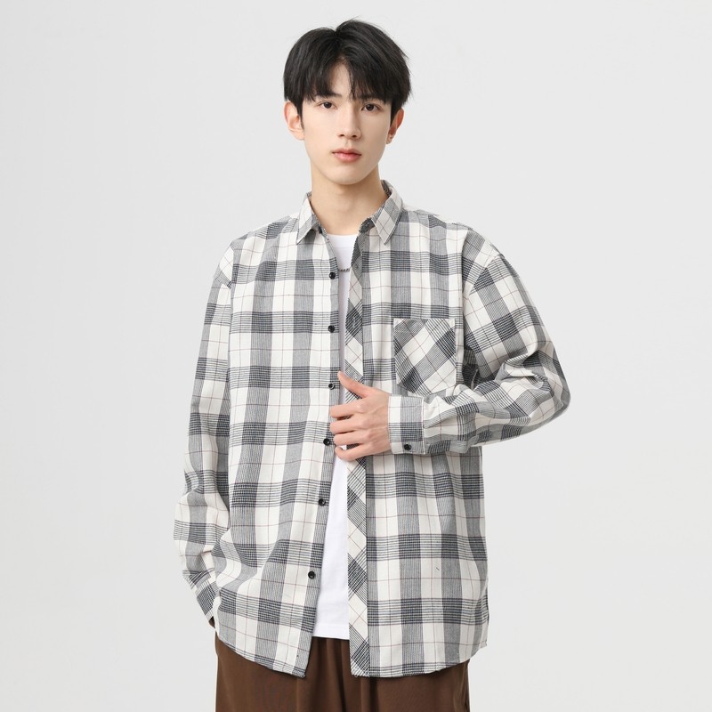 啄木鸟秋季新款男士长袖100%全纯棉磨毛格子衬衫 高级感休闲衬衣